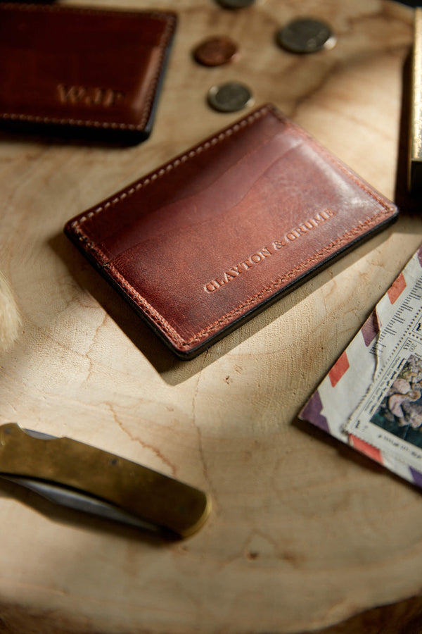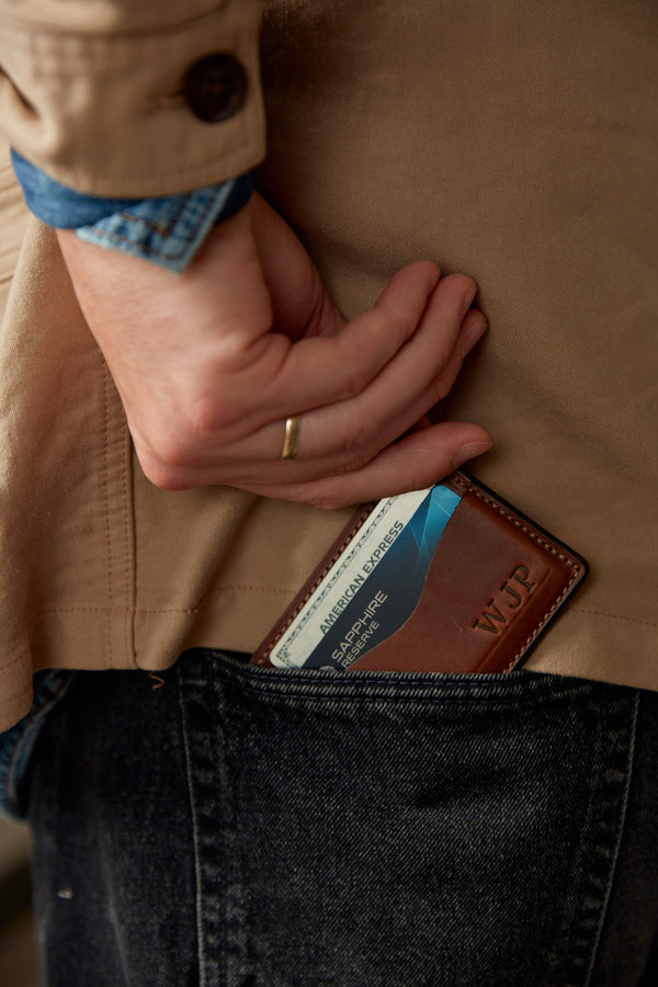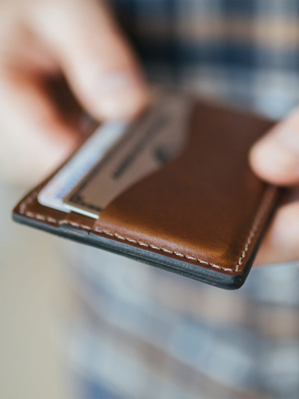Our handmade men's Business Cardholder is the perfect front-pocket solution. Credit cards, business cards, even folded cash fit perfectly inside. Easily fits 6-8 cards per side, offering a quality, durable carry-all to have on you at all times. Whether you are in the search for a slimmer option to a traditional bifold or a handmade business card holder, our Business Cardholder will fit the bill without the bulk.