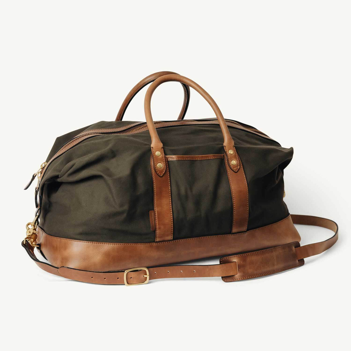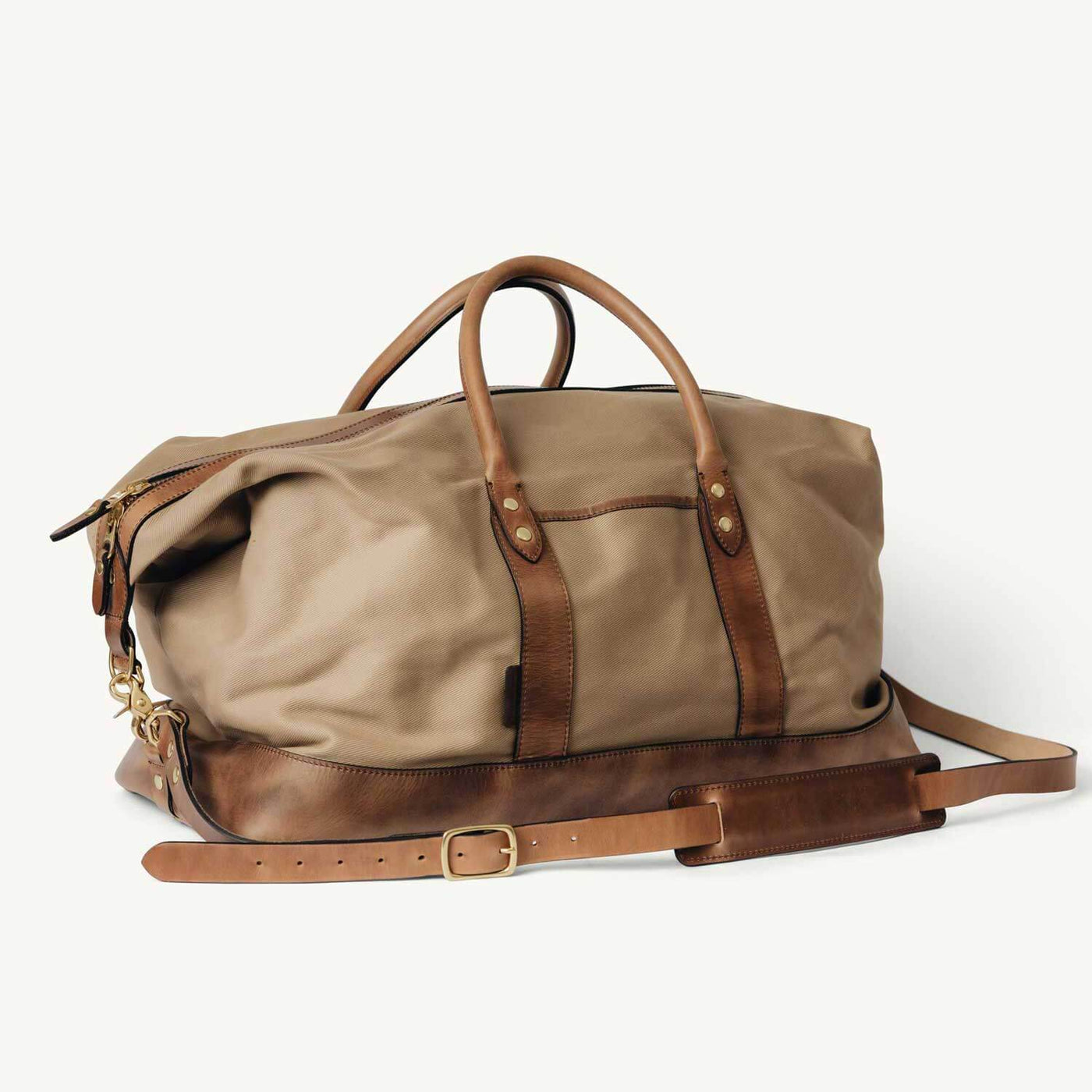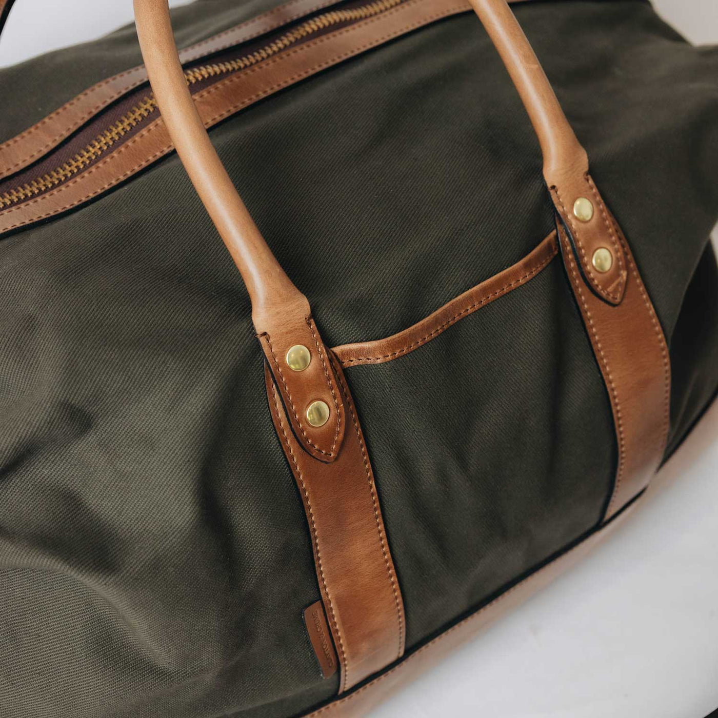 When designing this duffel, we strived to keep our same high standards in this new material. The body is cut from heavyweight, water-repellent 18 oz field-grade twill in those two hues, then finished with full-grain Horween leather at every touchpoint and locked down with solid brass hardware. Heavy duty, durable zippers keep the ride smooth and secure. When the miles add up, a quick wipe keeps it looking sharp.