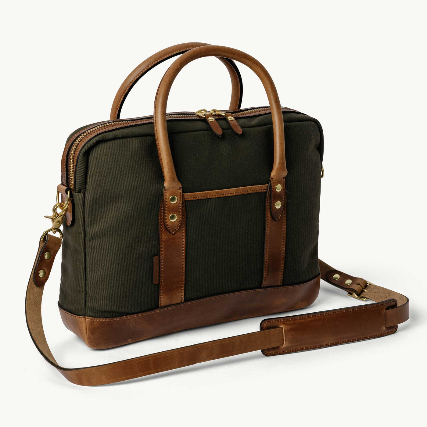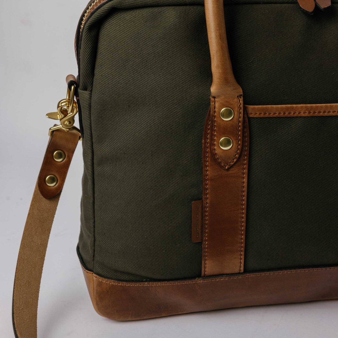 Our goal was to take the same quality and details in our leather messenger and bring them to canvas. The shell is cut from heavyweight, water-repellent 18 oz field-grade twill, then finished at every touchpoint with full-grain Horween leather and locked down with solid brass hardware. A heavy-duty zipper keeps the main compartment secure. When the day gets long, a quick wipe keeps it looking sharp.