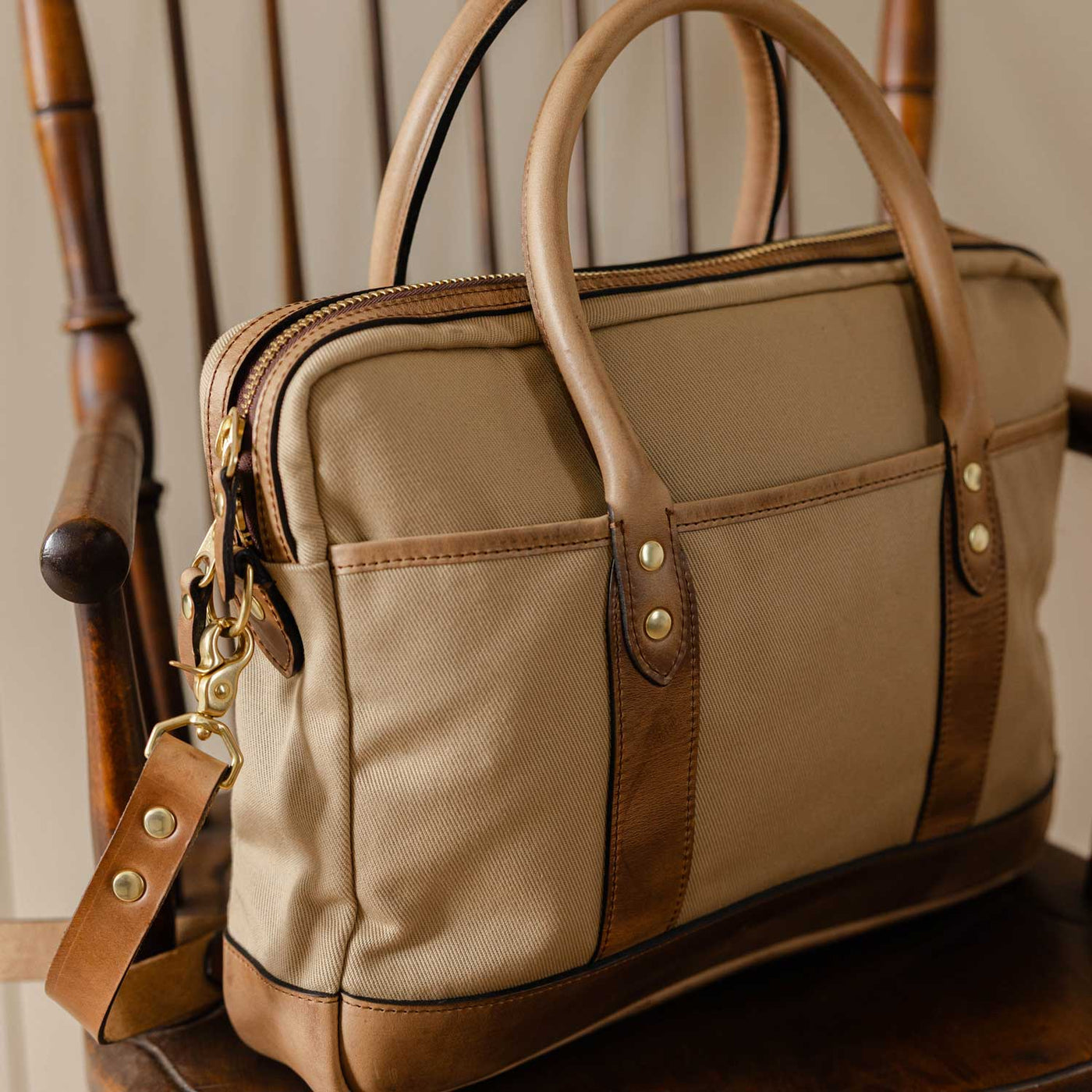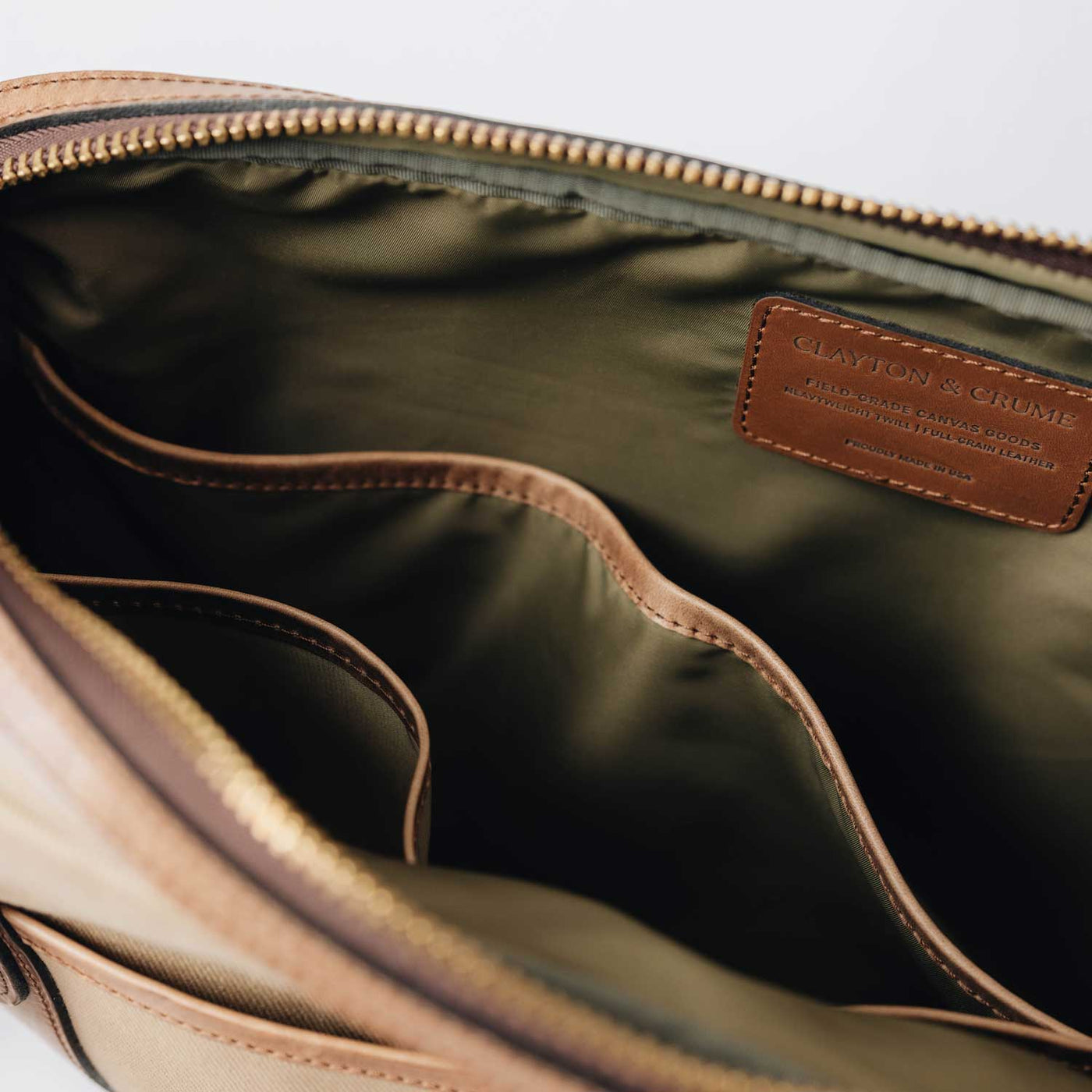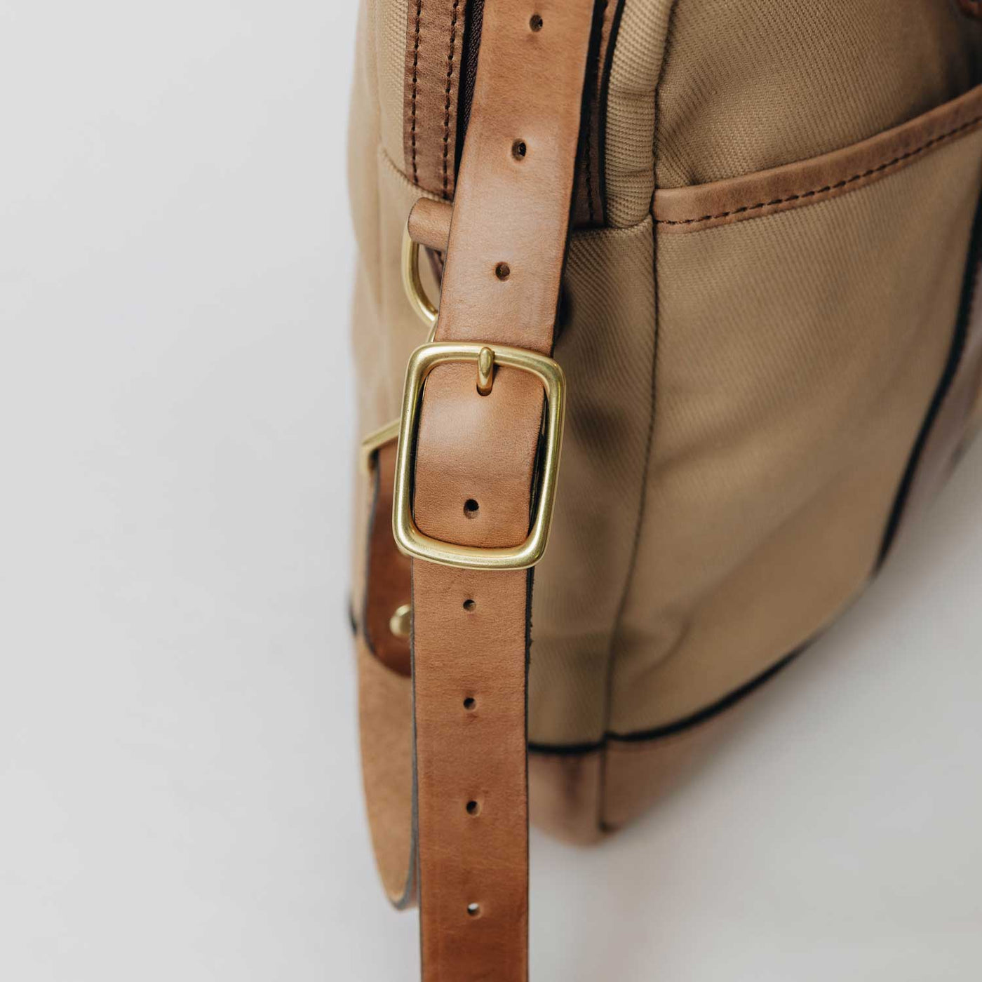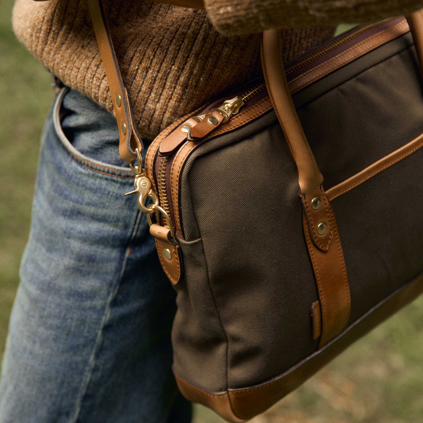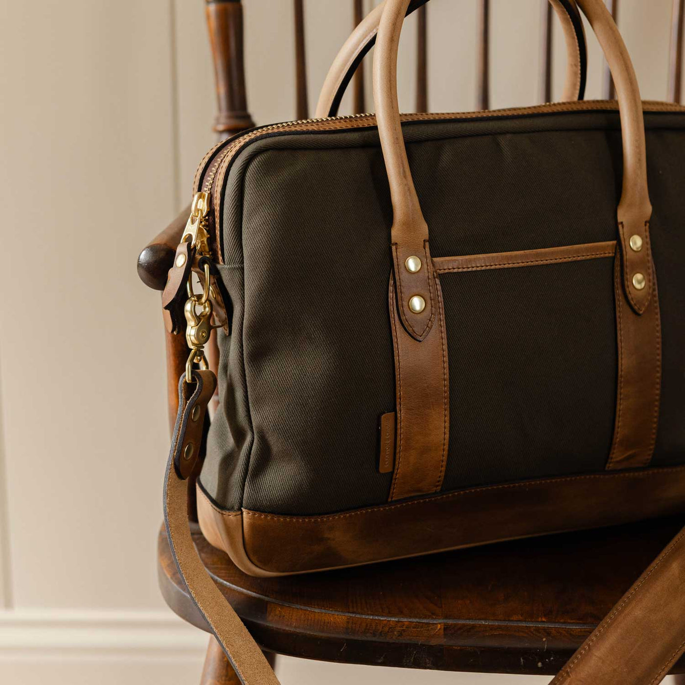 Our goal was to take the same quality and details in our leather messenger and bring them to canvas. The shell is cut from heavyweight, water-repellent 18 oz field-grade twill, then finished at every touchpoint with full-grain Horween leather and locked down with solid brass hardware. A heavy-duty zipper keeps the main compartment secure. When the day gets long, a quick wipe keeps it looking sharp.