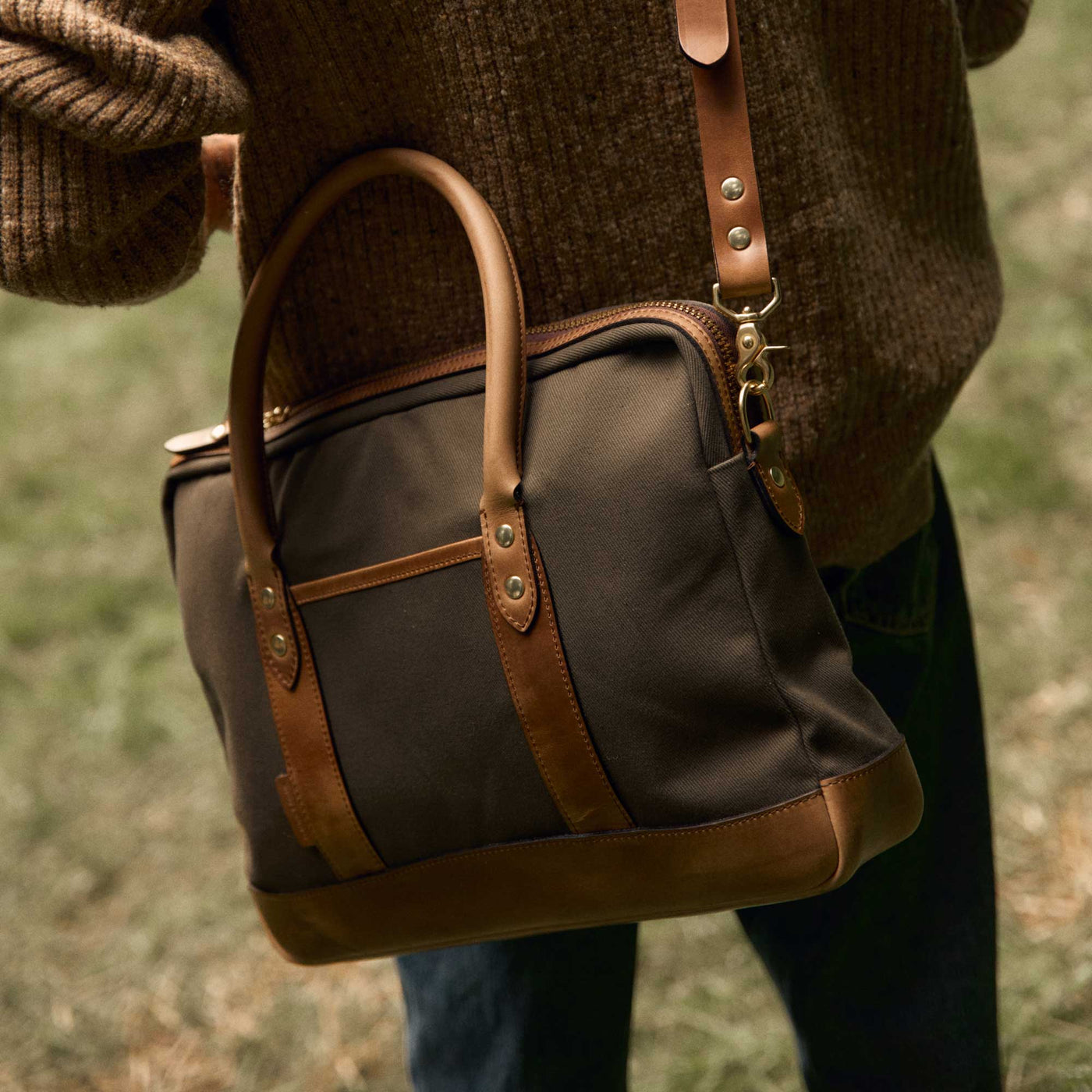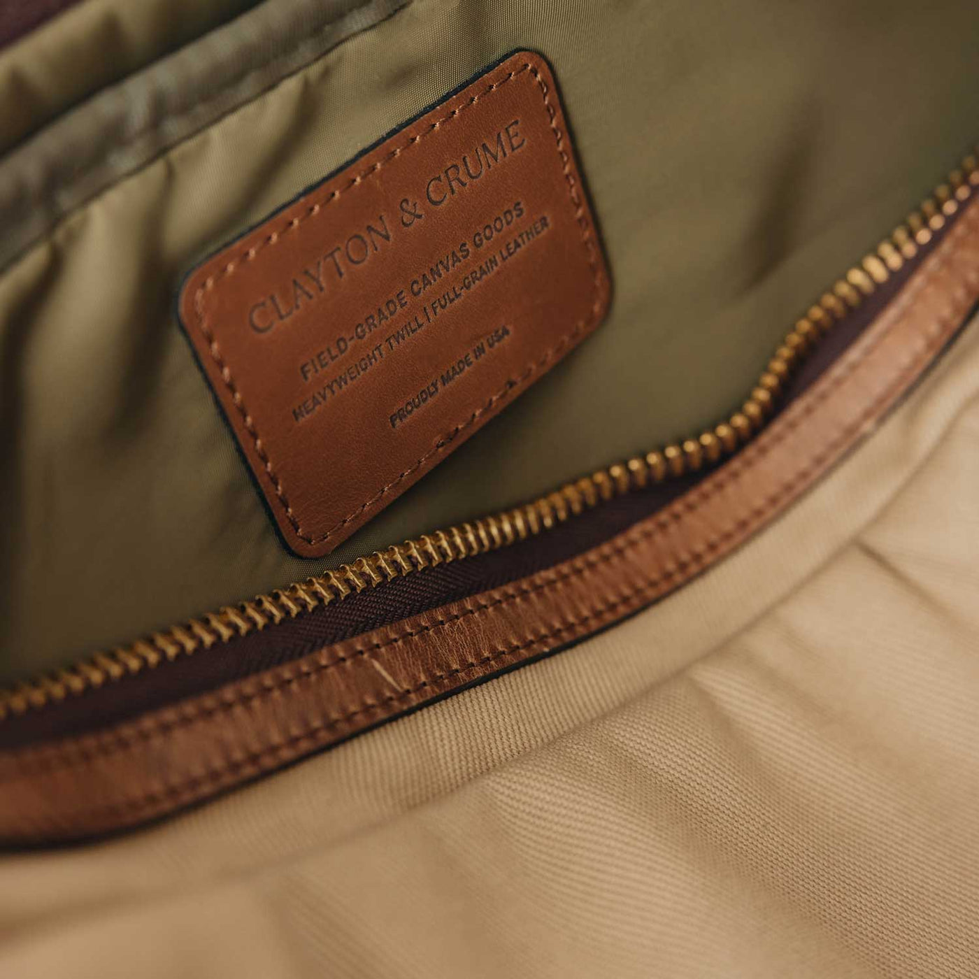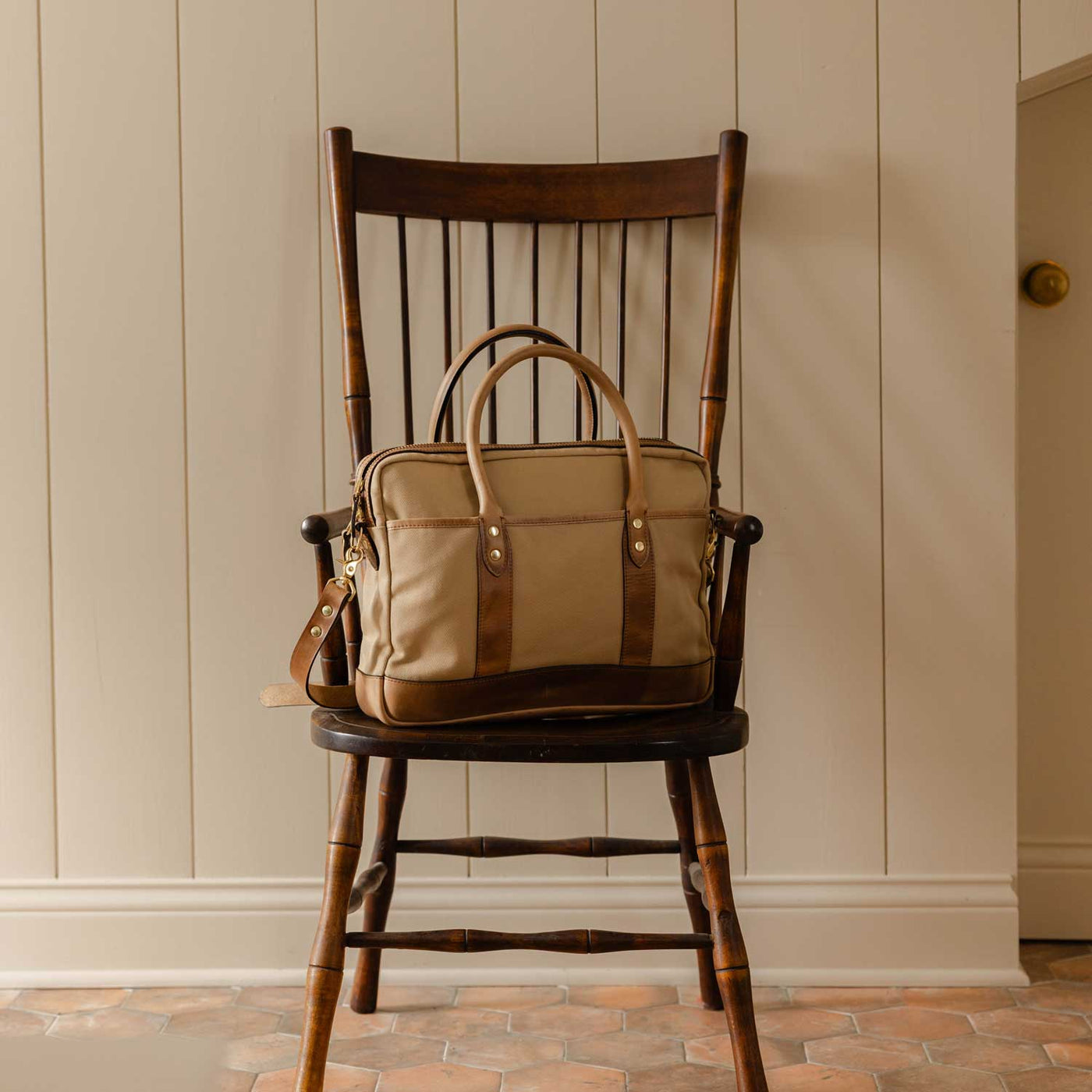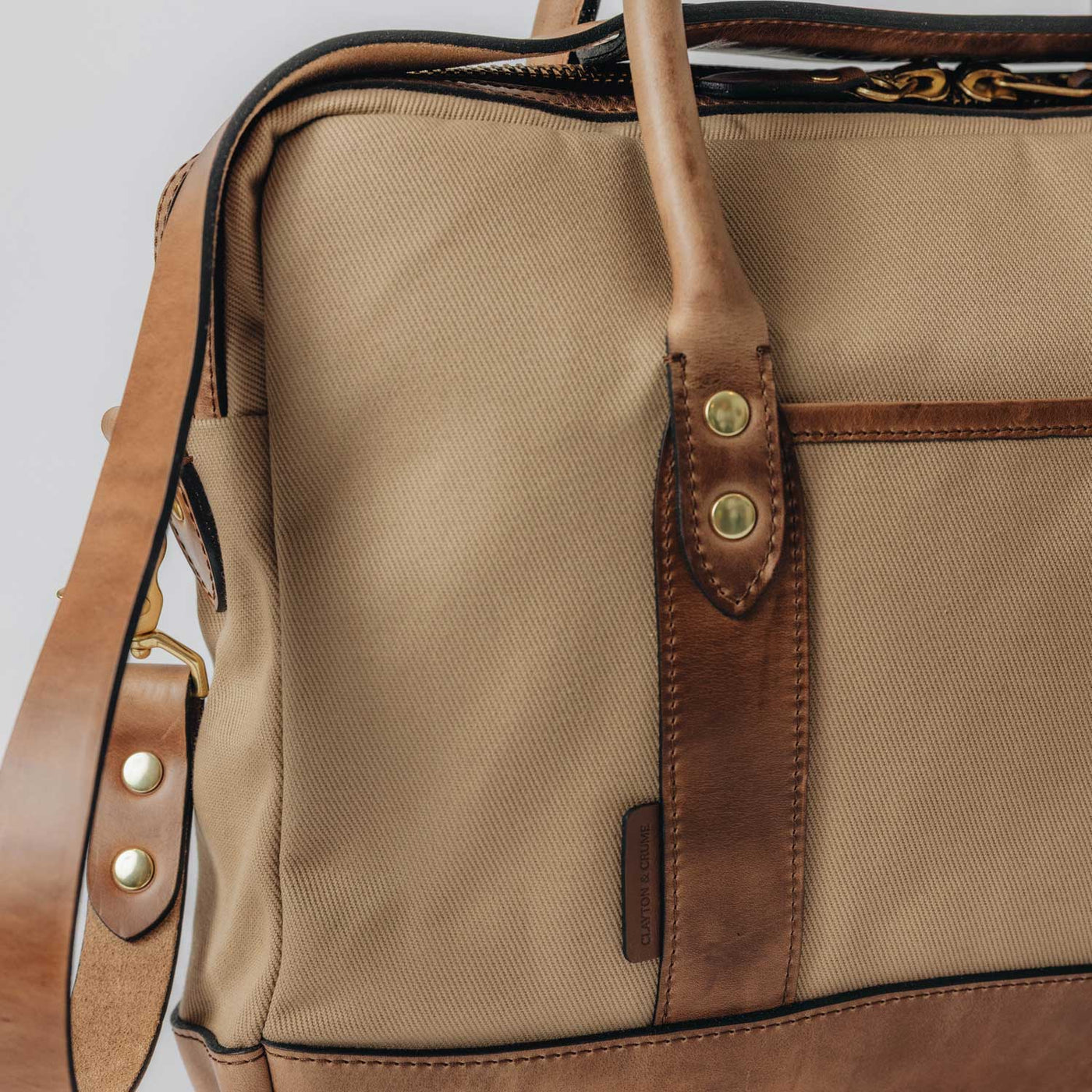 Our goal was to take the same quality and details in our leather messenger and bring them to canvas. The shell is cut from heavyweight, water-repellent 18 oz field-grade twill, then finished at every touchpoint with full-grain Horween leather and locked down with solid brass hardware. A heavy-duty zipper keeps the main compartment secure. When the day gets long, a quick wipe keeps it looking sharp.
