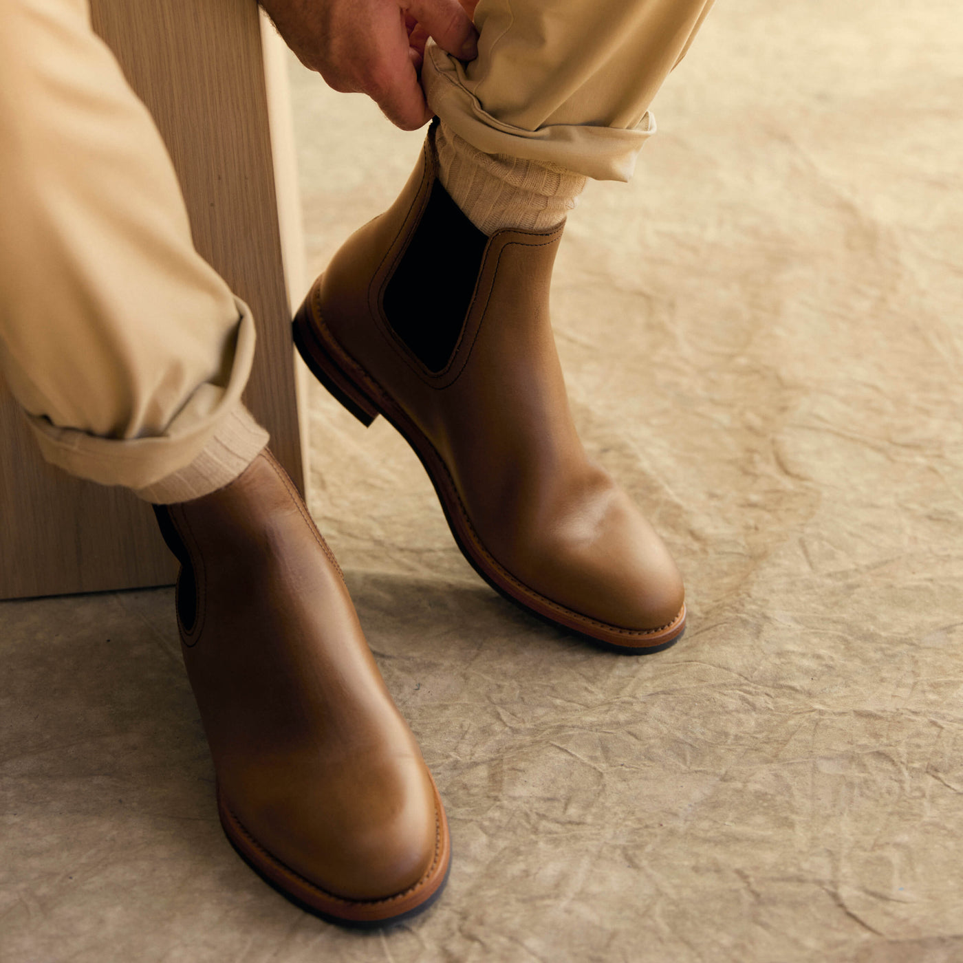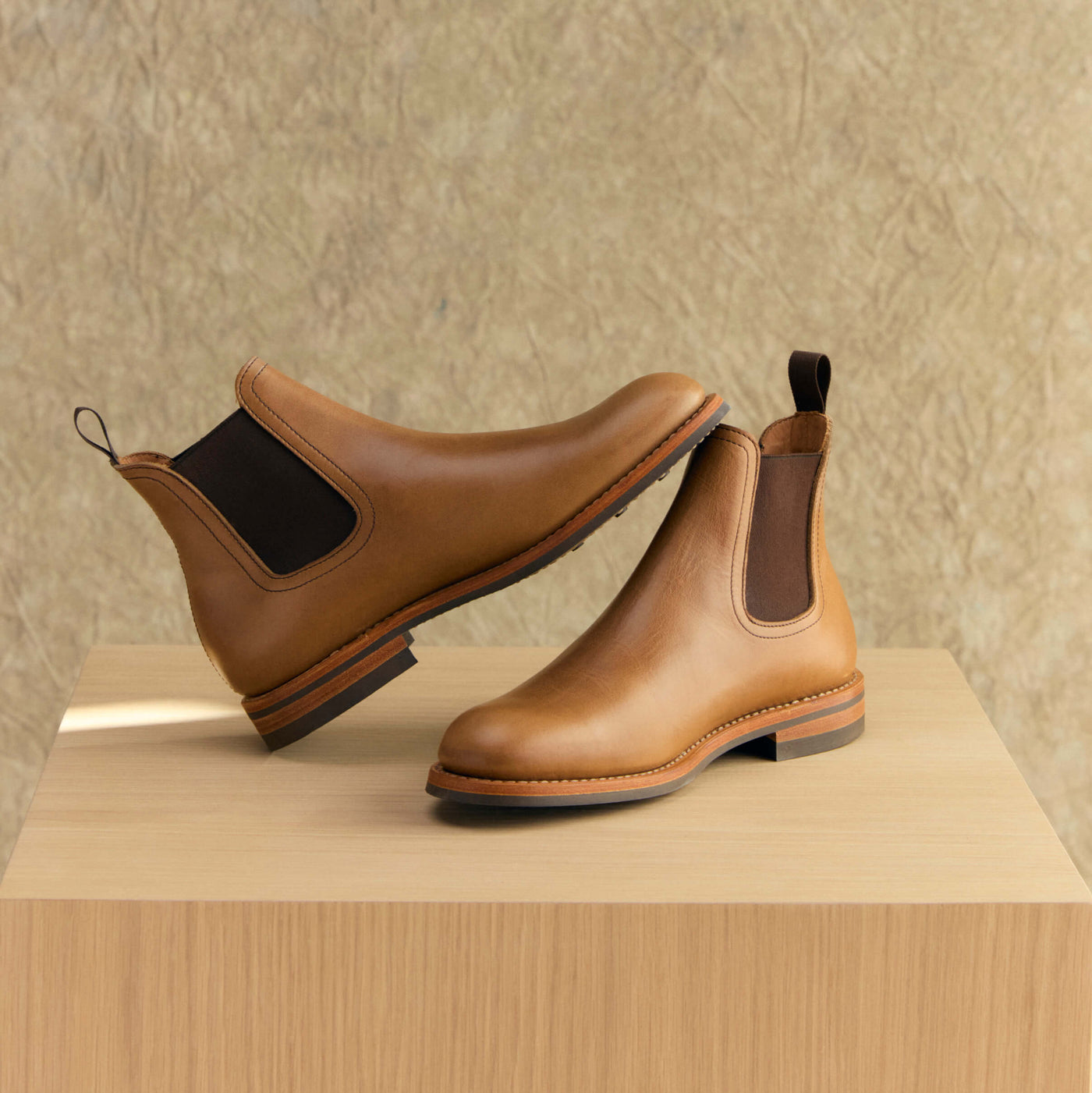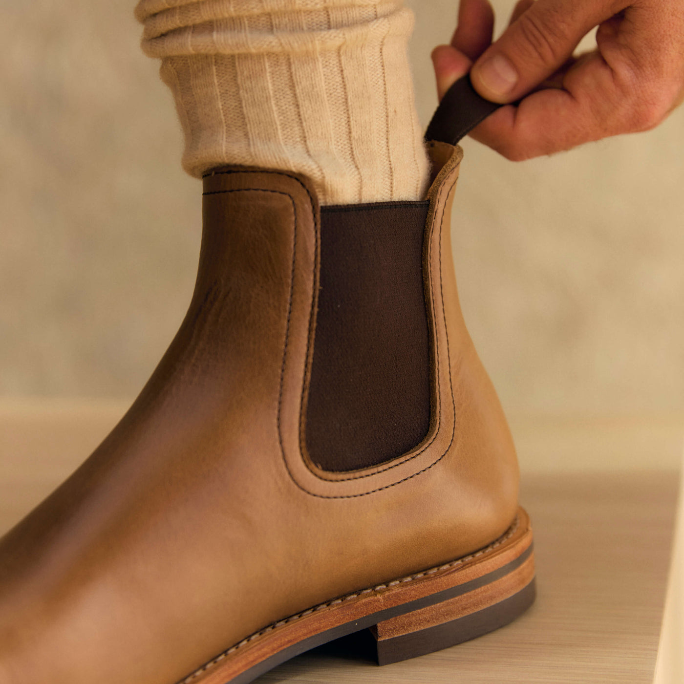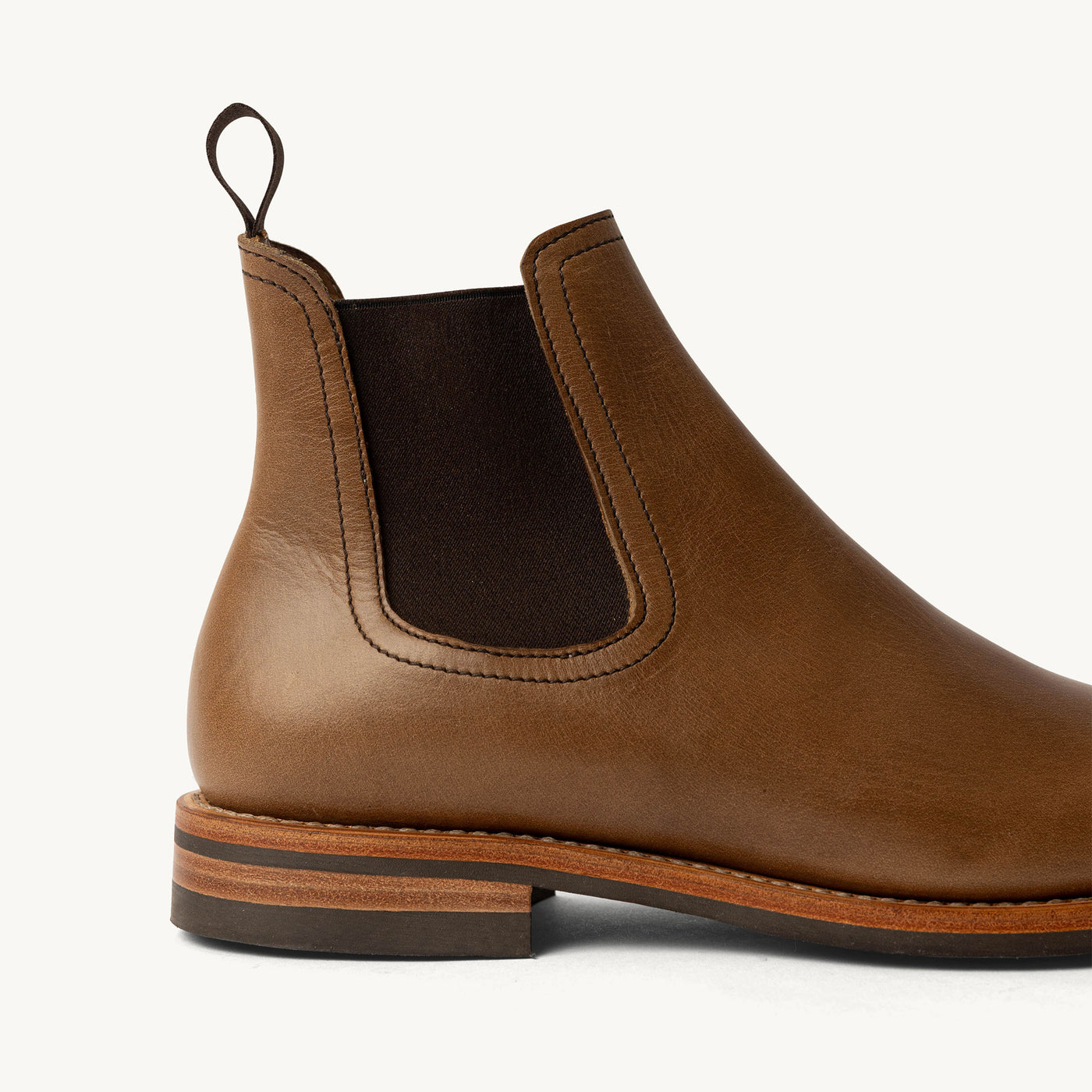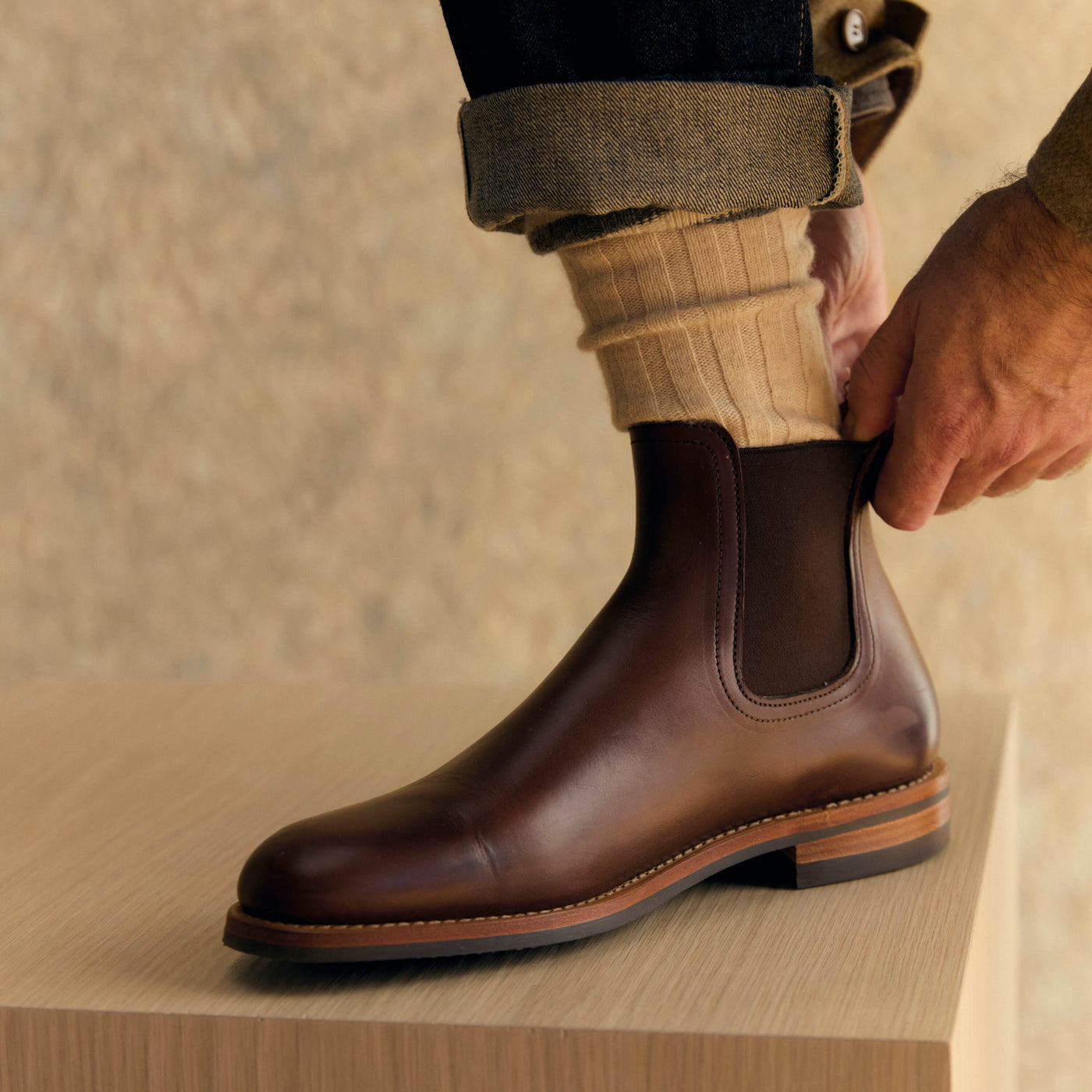 Our Chelsea Boots are crafted with USA Horween Leather, sourced directly from the tannery in Chicago. Chromexcel leather was developed a century ago and it was made specifically for boots. It’s a high-quality leather, hot-stuffed with oils and waxes, making it highly weather-resistant. You can wear these boots in rain or snow, and they’ll hold up beautifully. Chromexcel leather is also exceptionally soft, allowing for a quick and comfortable break-in period.
