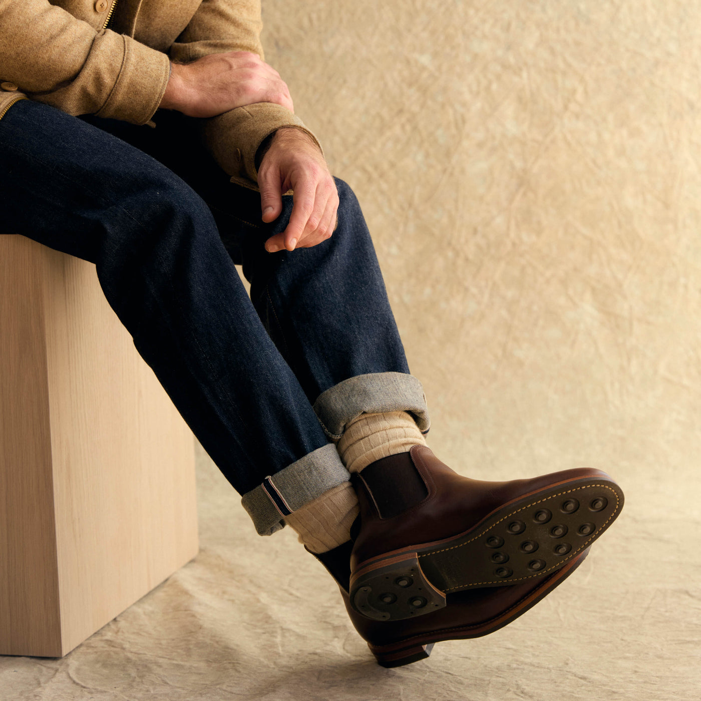 We decided on the Chelsea boot for its unique style. Leather wrapping from heel to toe, and heavy stitching surrounding an elastic band for effortless wear. We opted for an almond-shaped toe box, blending the rounded look of American work boots with the pointed shape of European styles. This design gives the boot a slightly more formal look without being overly trendy.