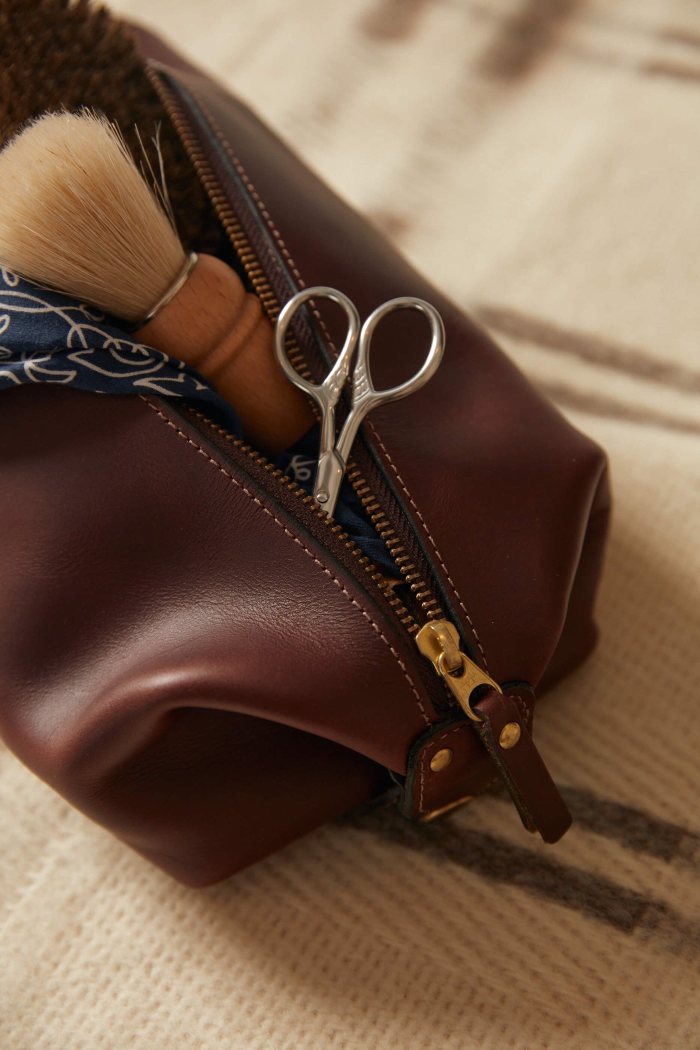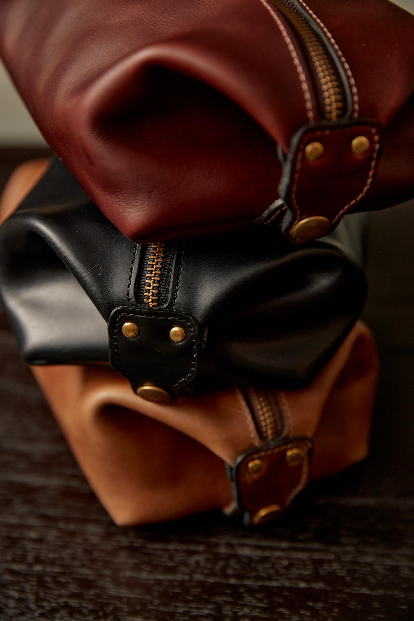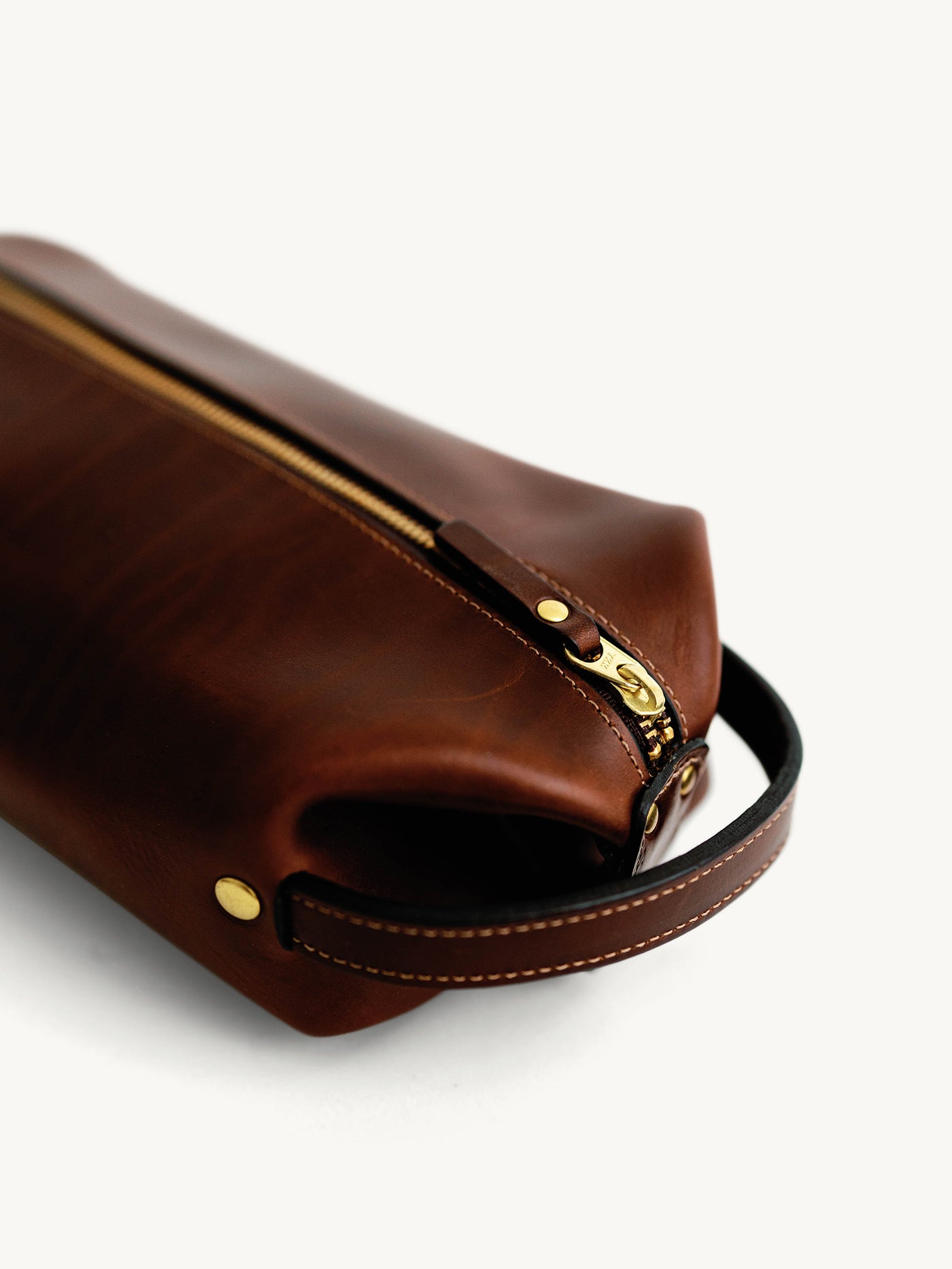 Our handmade men's leather Dopp Kit is built to stand the test of time, like the one grandpa used for decades. Perfectly sized to fit all your travel accessories-- you'll be surprised how much it can hold. Premium Horween full-grain leather and robust stitching for many years of service, guaranteed.