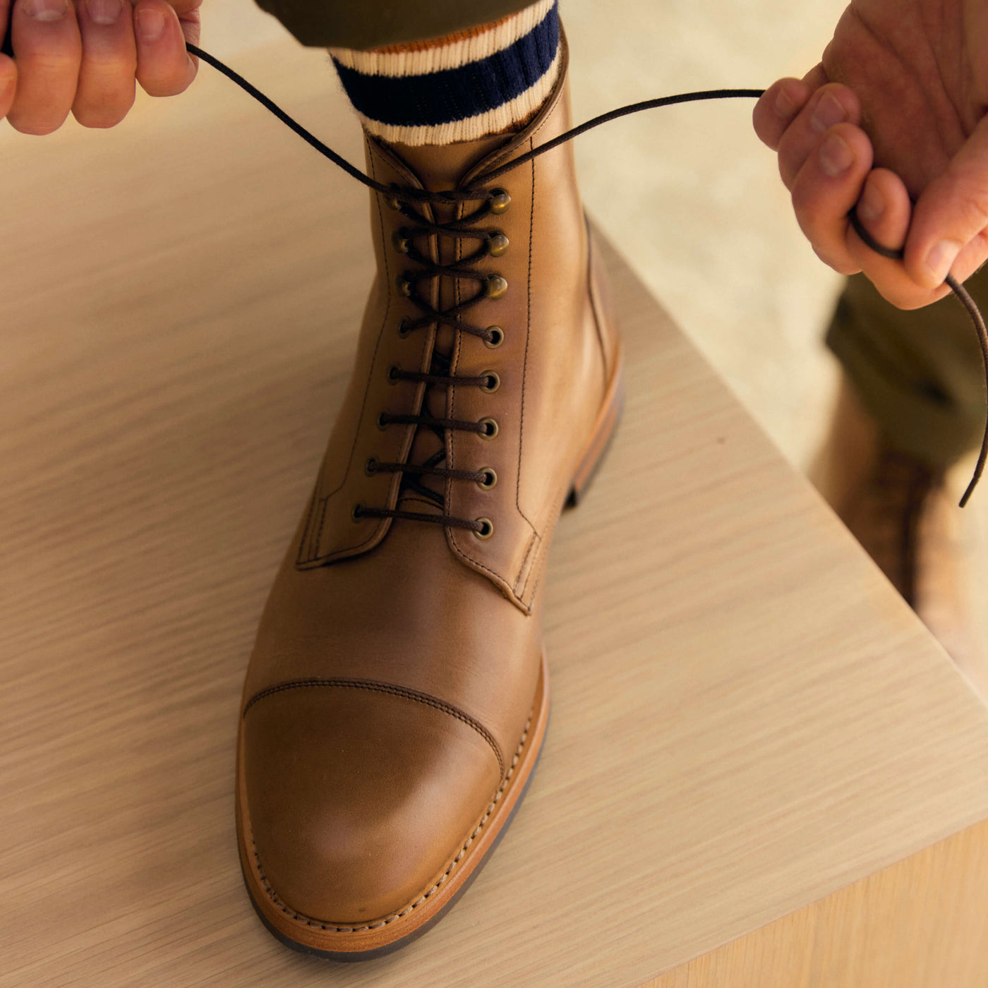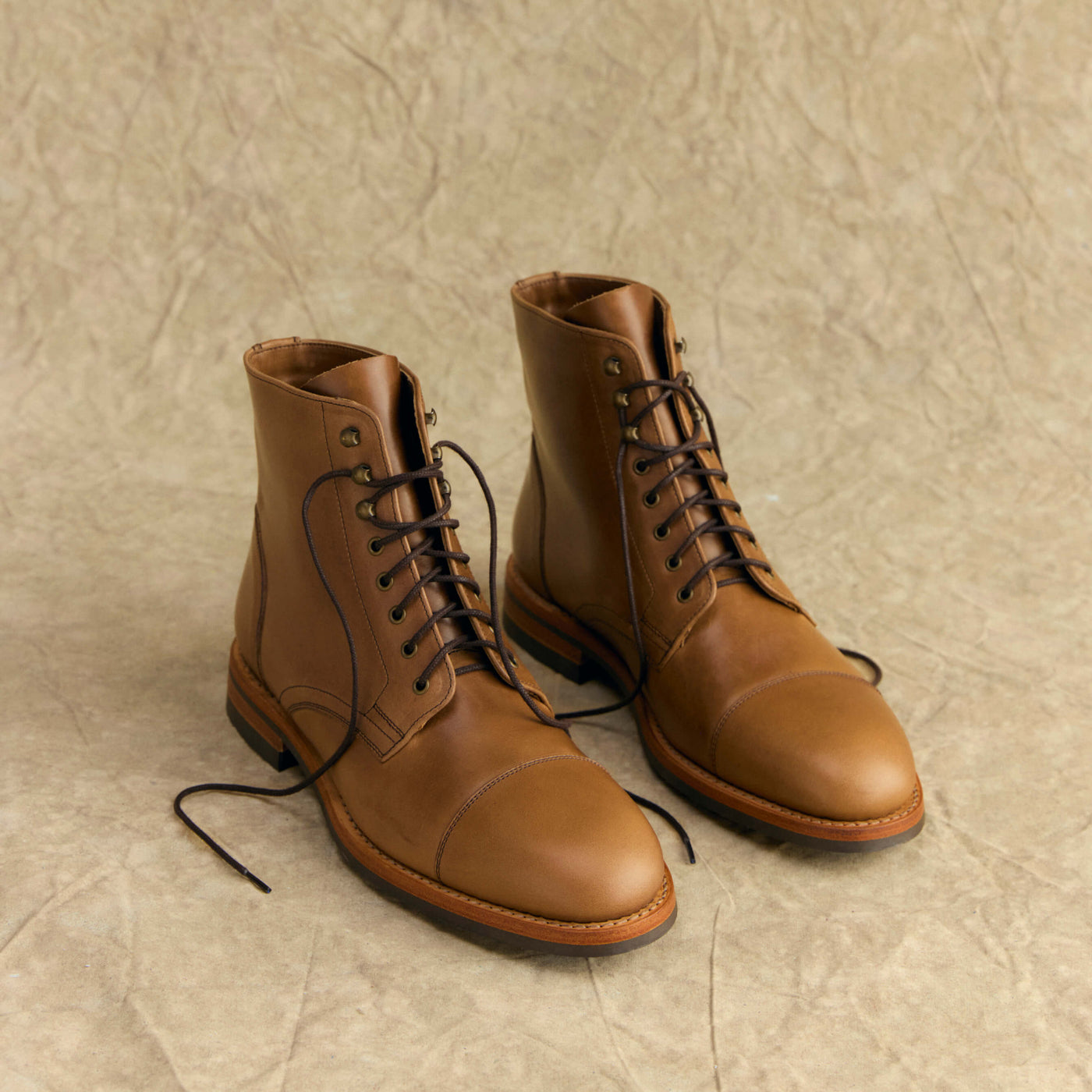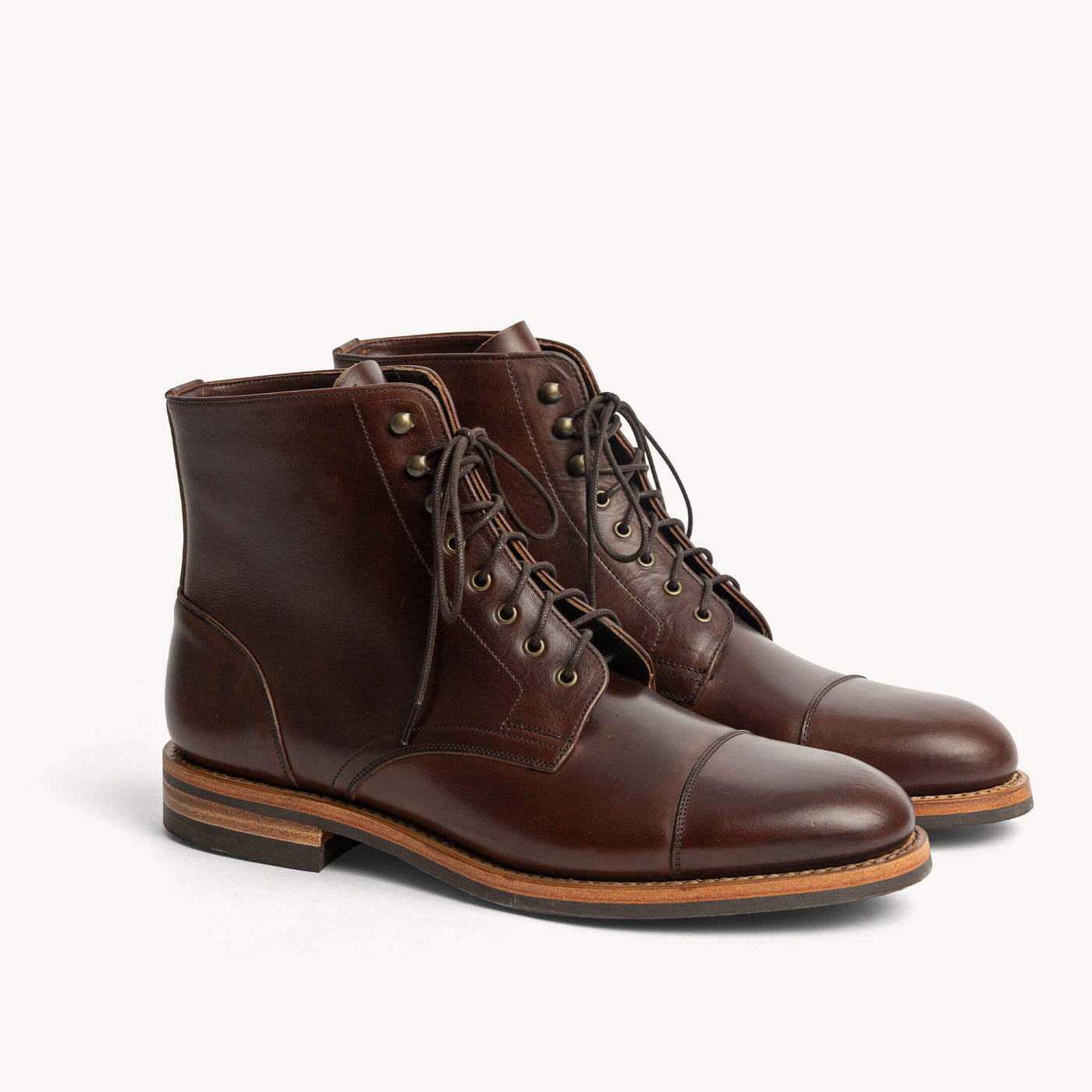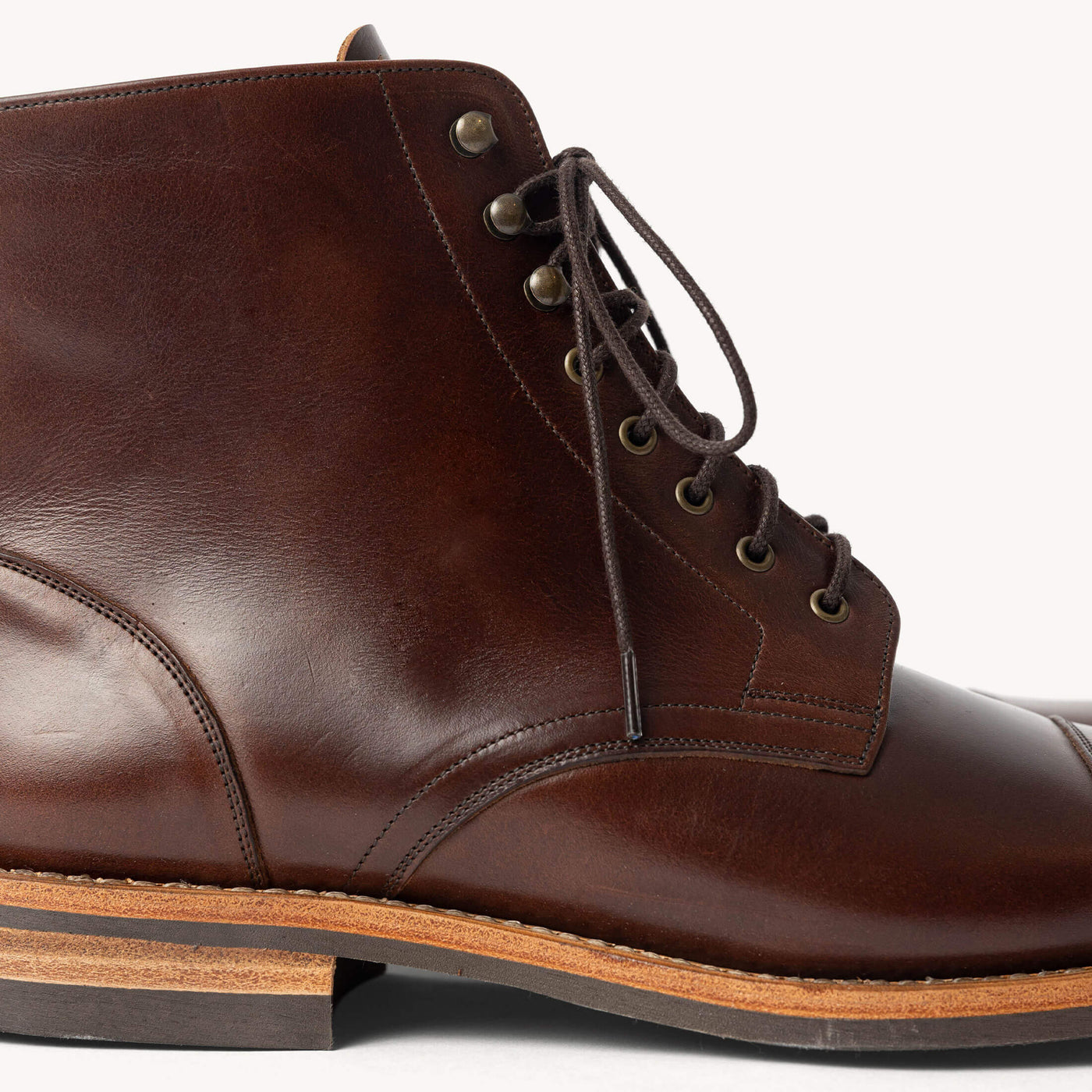 We decided on the Heritage boot for its practical versatility and enduring design. Leather wrapping from heel to toe, and heavy stitching with lace up speed hooks, this boot is made for everyday wear. We opted for an almond-shaped toe box, blending the rounded look of American work boots with the pointed shape of European styles. This design gives the boot a slightly more formal look without being overly trendy.