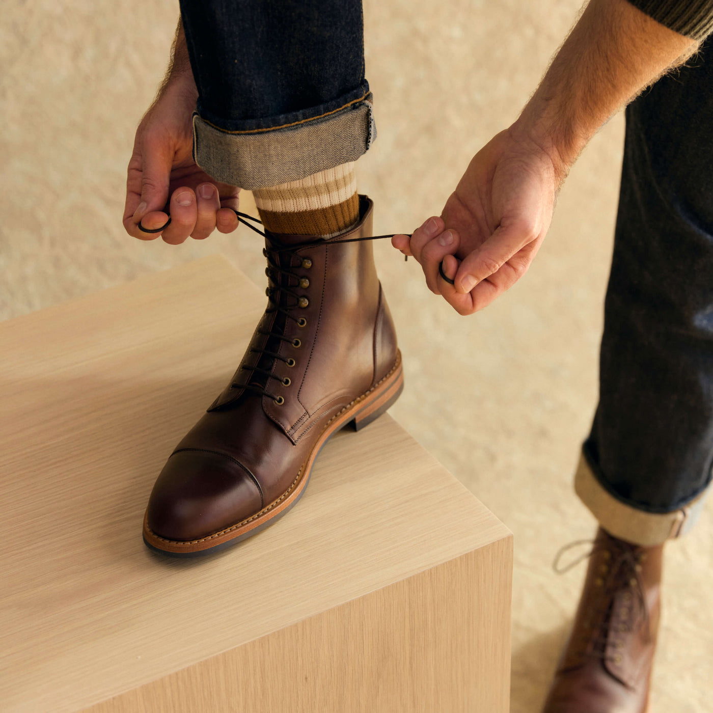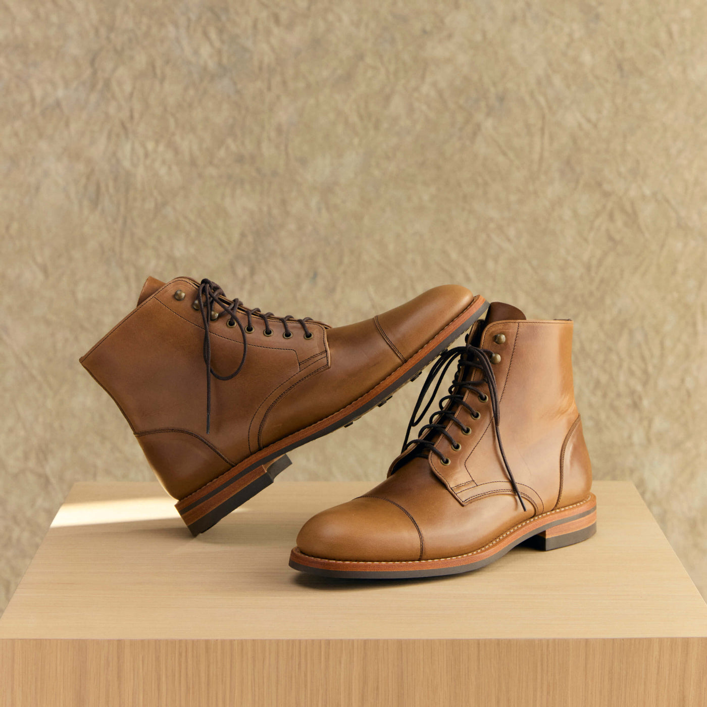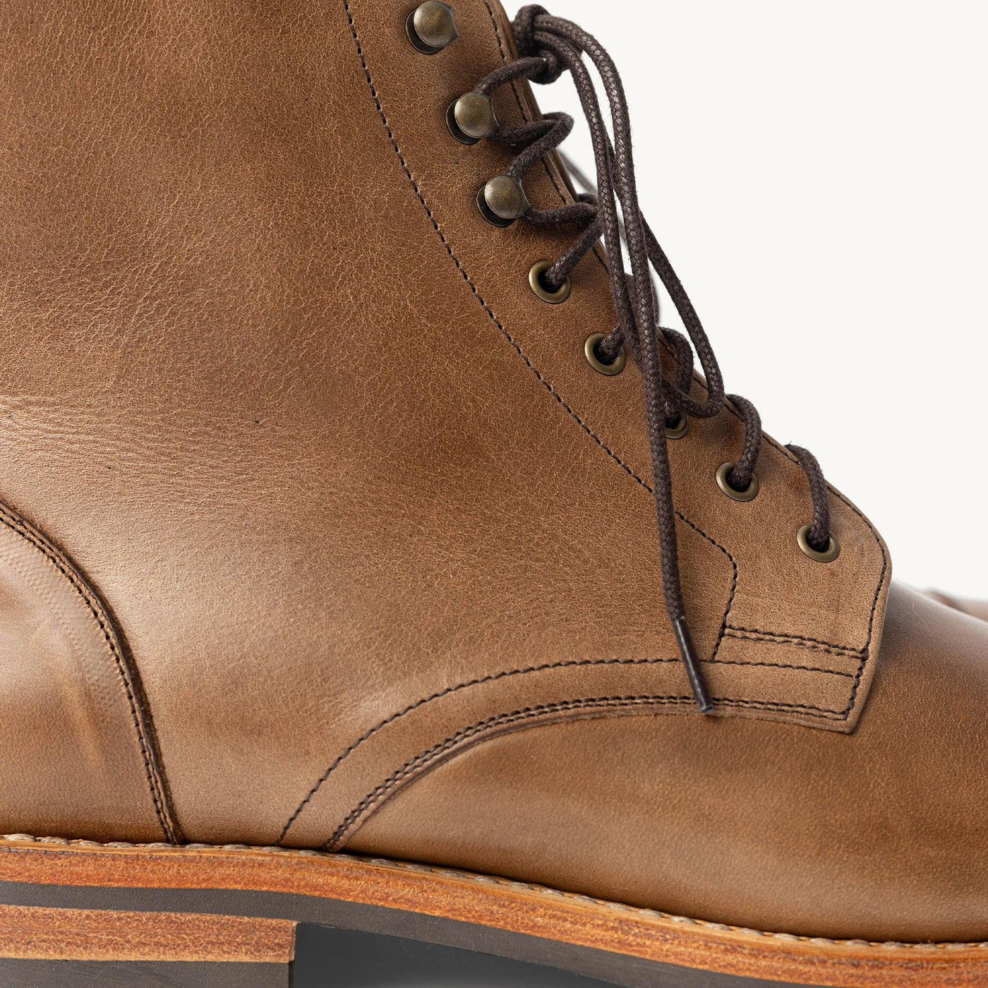 The construction of our boots follows the time-tested method of Goodyear welting, which dates back over 100 years. With Goodyear welting, the space inside the sole is filled with hot cork after stitching, which allows it to mold to your foot, creating a custom, comfortable fit. Goodyear-welted boots are rare in today’s market because the method is costly and time-consuming, but it's the best for construction and we wanted to craft the best pair of boots.