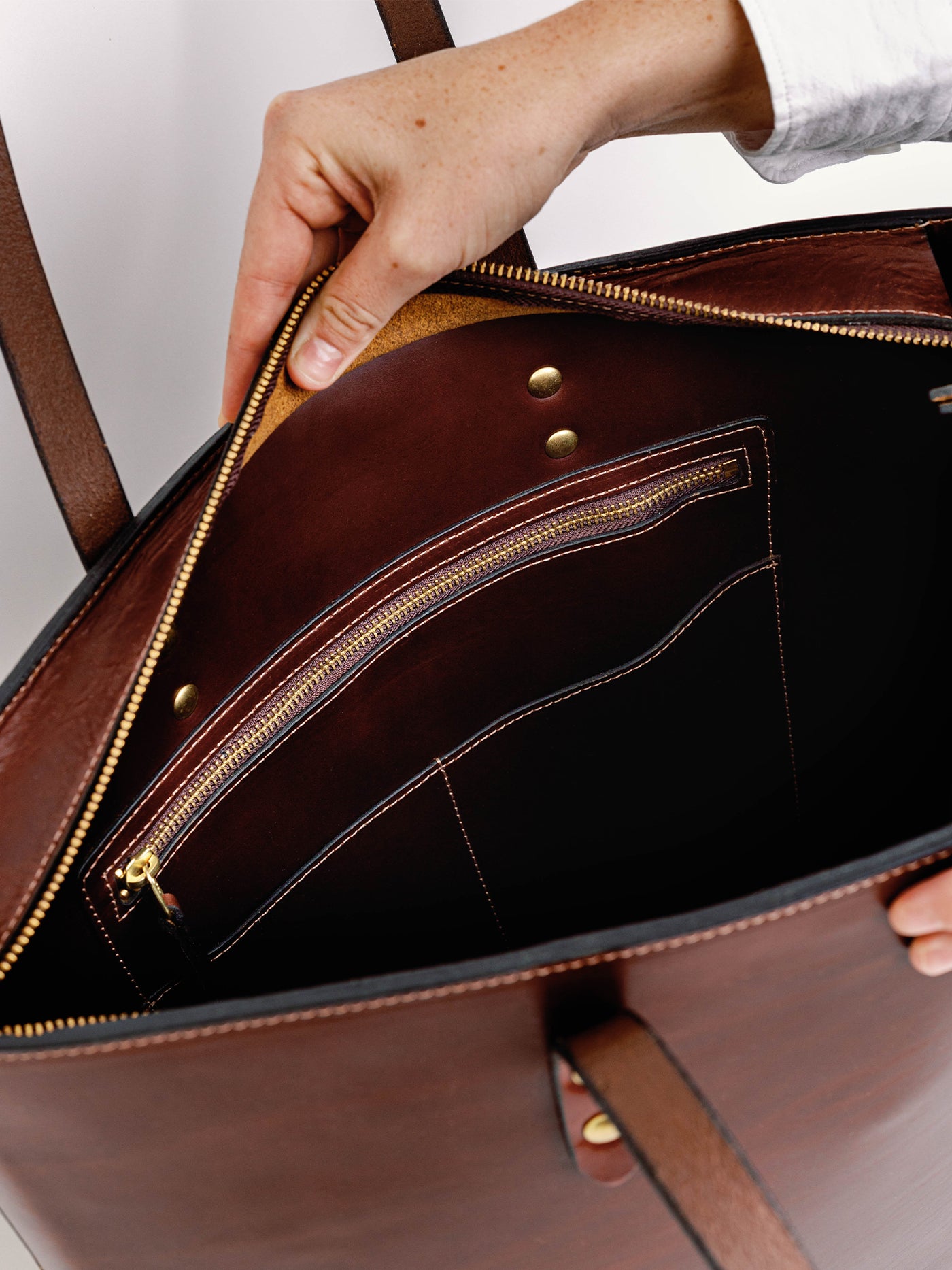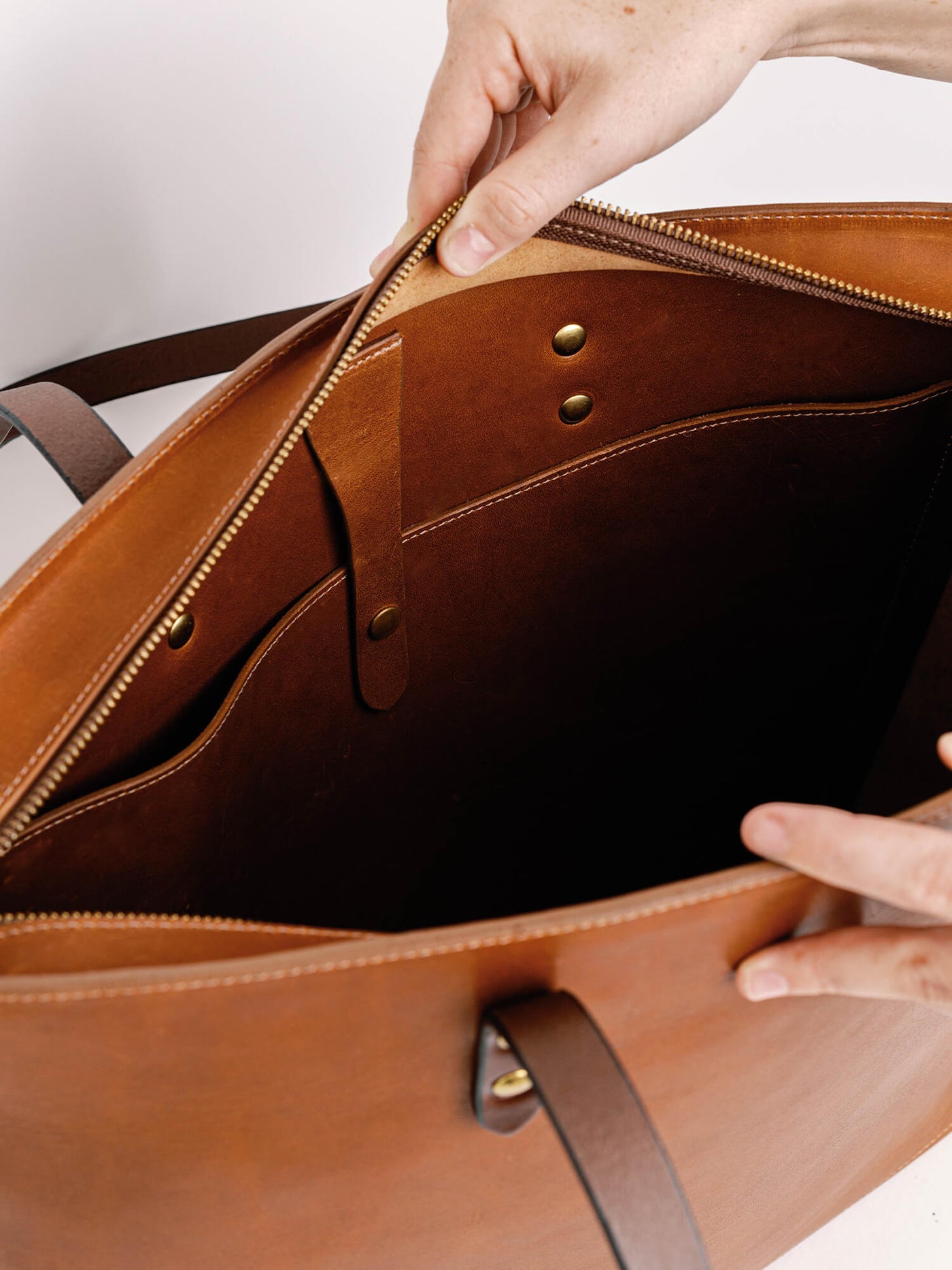 Our Large Zip Tote is meticulously handcrafted, constructed with the highest quality full-grain leather, stitched with robust thread, and finished with our solid brass hardware —guaranteed to outlast any handbag in your closet. Our leather bags are backed with our honest guarantee: we stand behind the leather goods that we create.