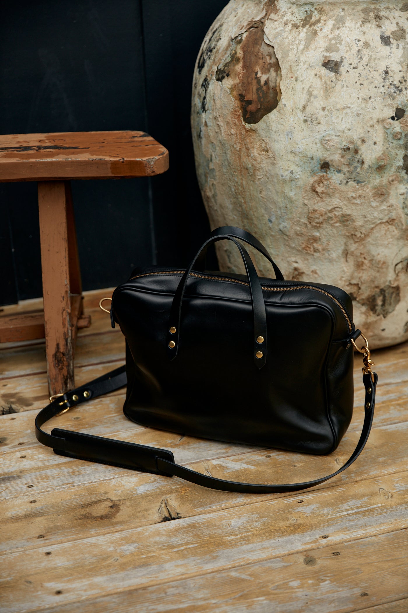 A sleek and subtle premium full -grain leather shell with designated laptop pocketing and a heavy duty zipper. No more than you need, and no less. No hinges, no hard corners, and no silly locking mechanism for which the keys have long since been misplaced.