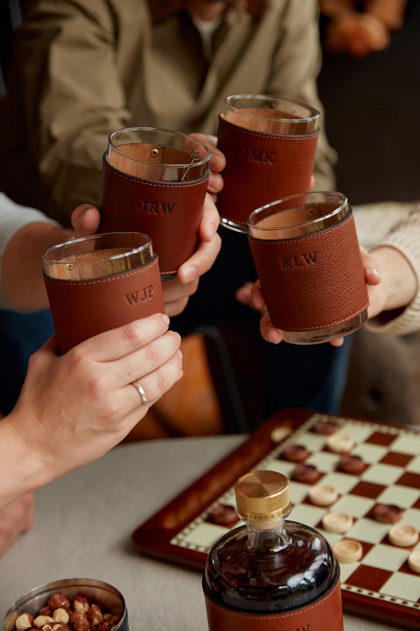 Our Rocks Glasses boast full-grain leather, robust stitching, and solid brass rivets for a secure hold.