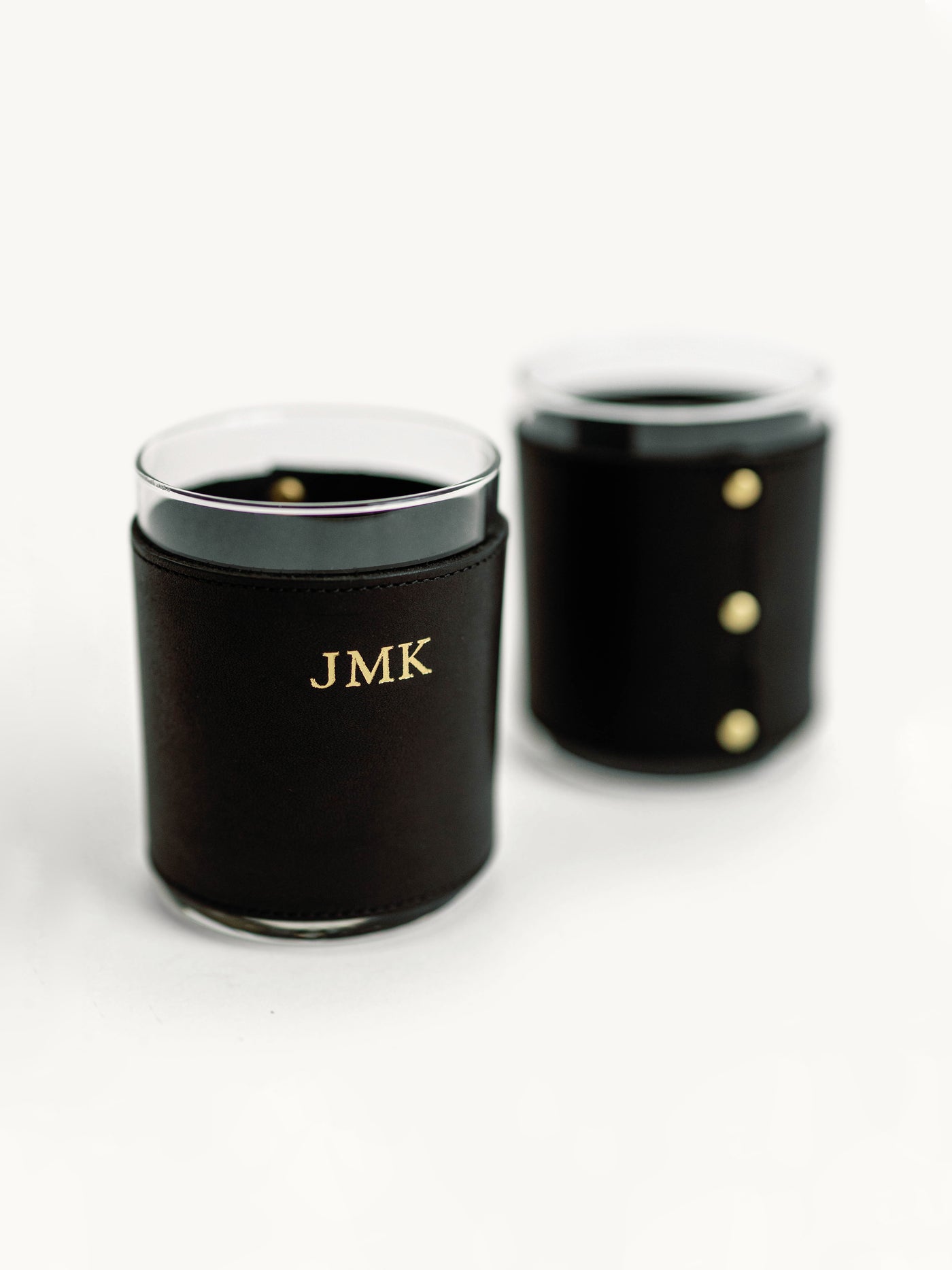 Customize your handmade leather Rocks Glasses (set of two) with a complimentary monogram (Up to 3 letters).