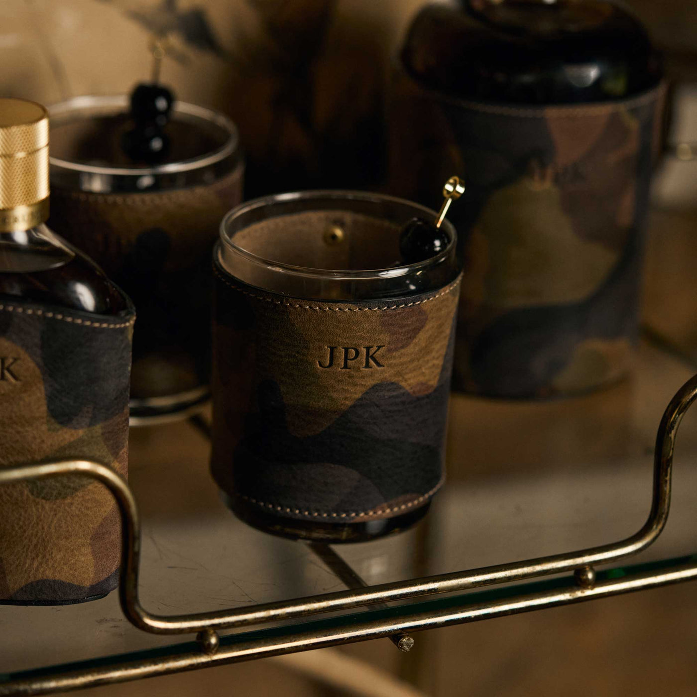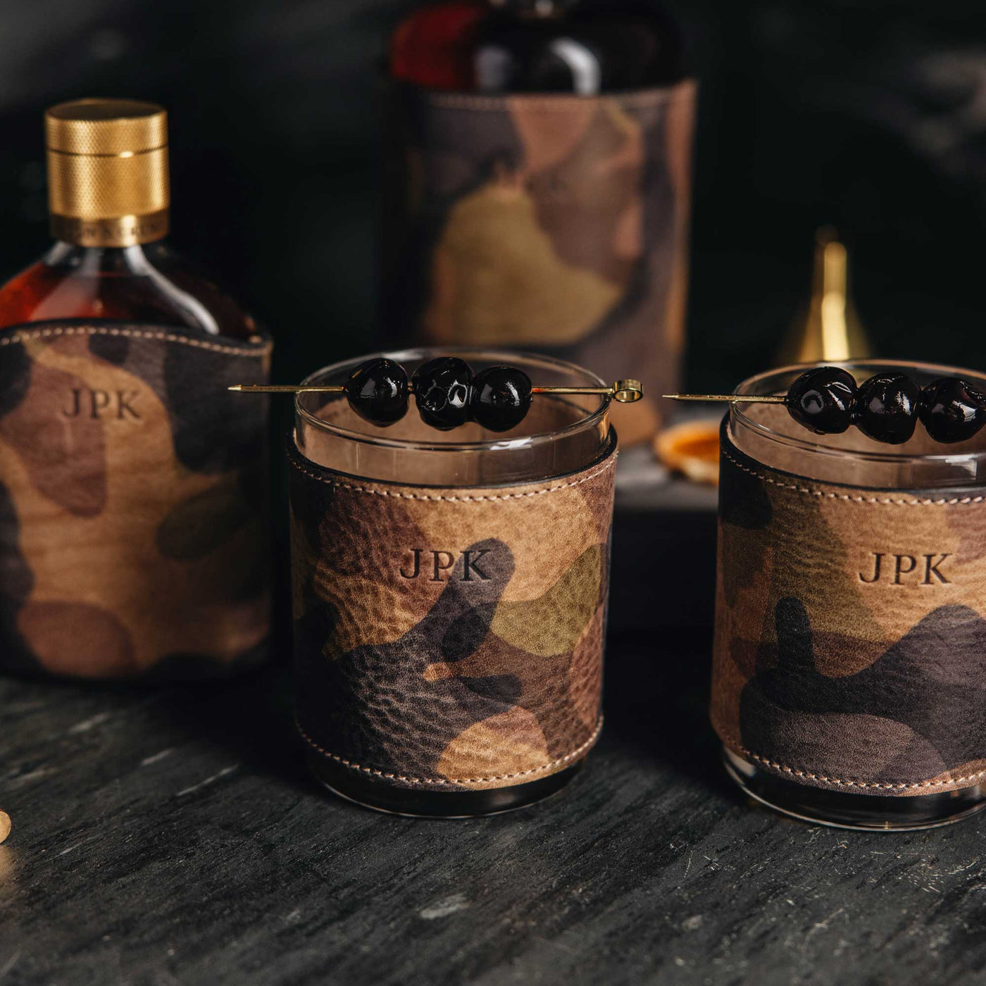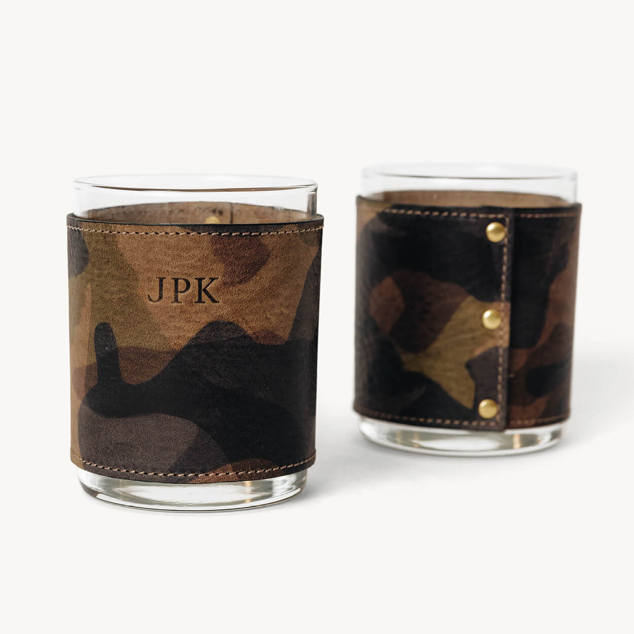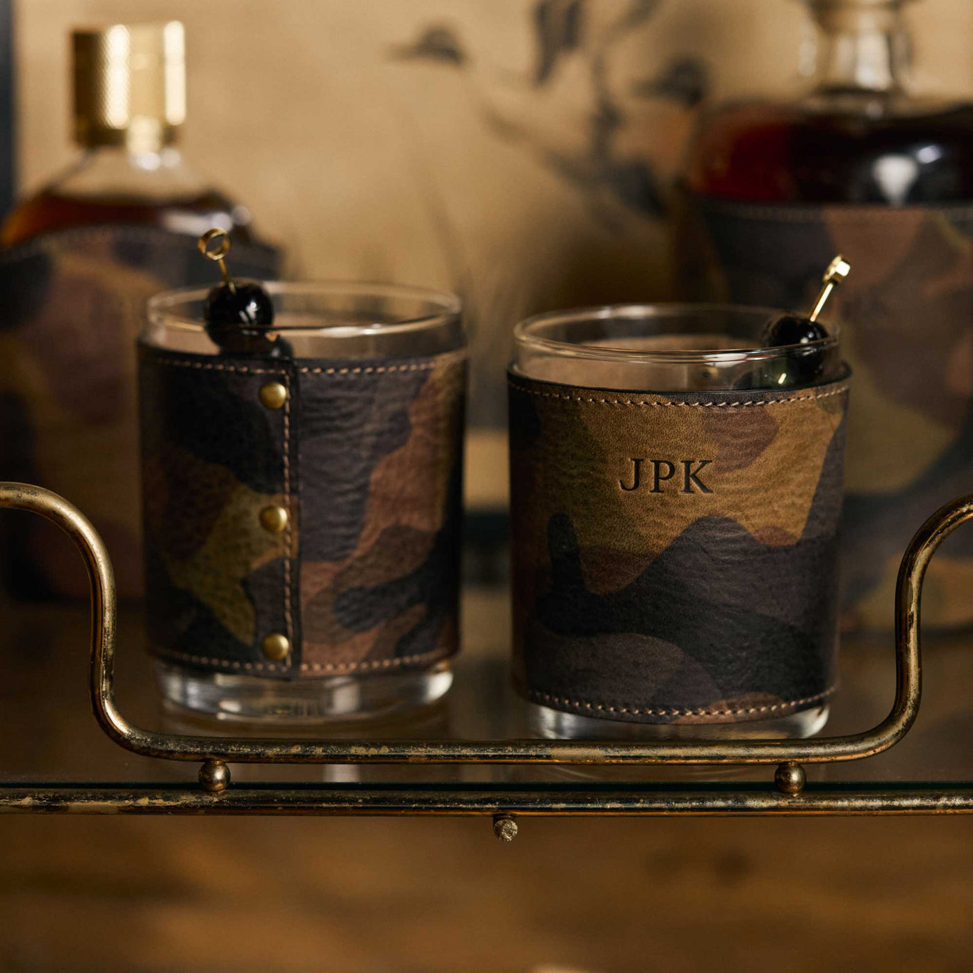 Customize your handmade leather Rocks Glasses (set of two) with a complimentary monogram (Up to 3 letters).