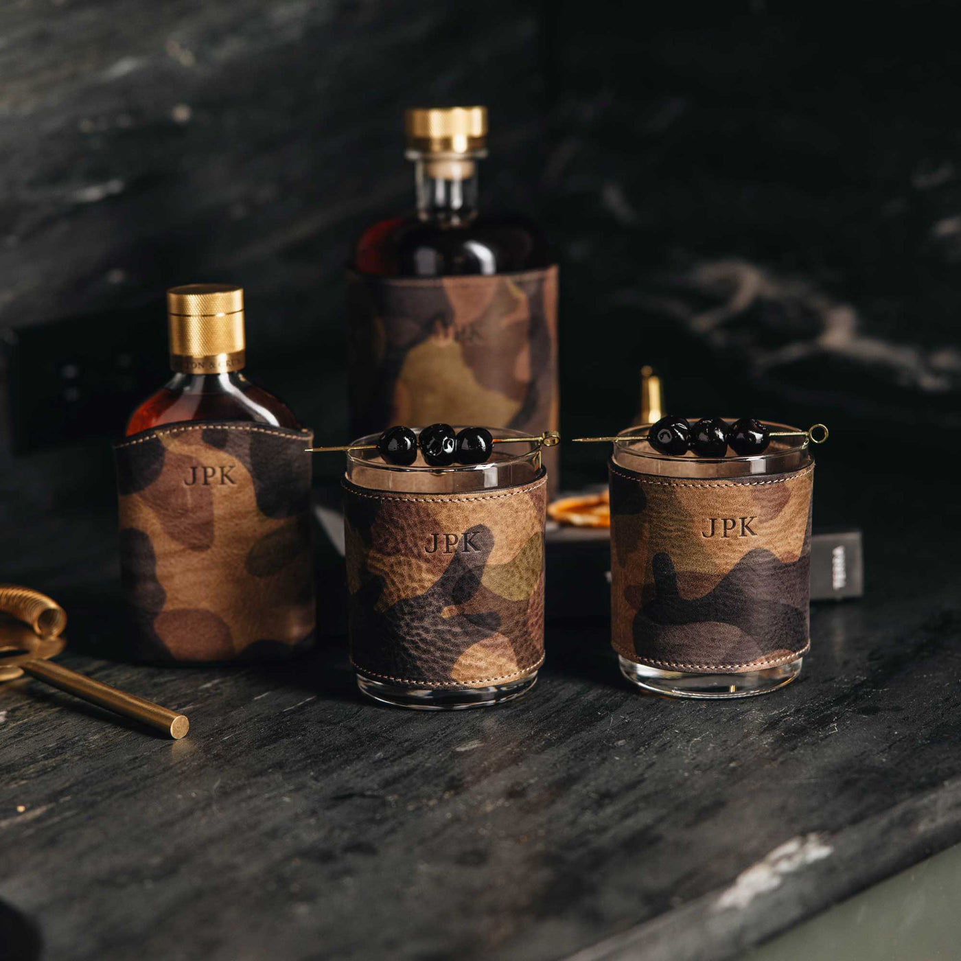 Our Rocks Glasses boast full-grain leather, robust stitching, and solid brass rivets for a secure hold.