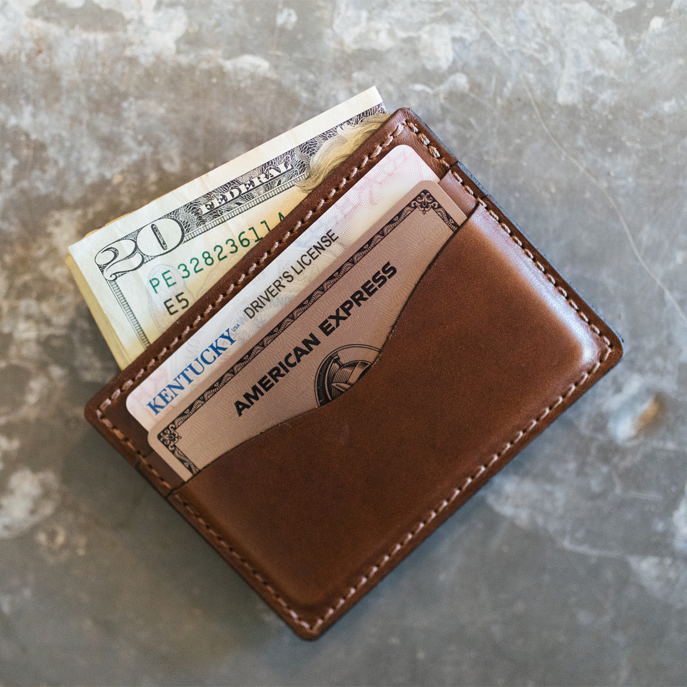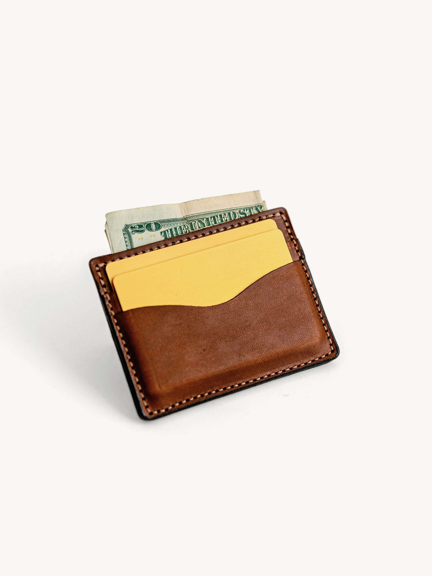 Our Slim Wallet holds 10-12 cards plus a pocket for folded bills to keep your carry lightweight and eliminate clutter.
